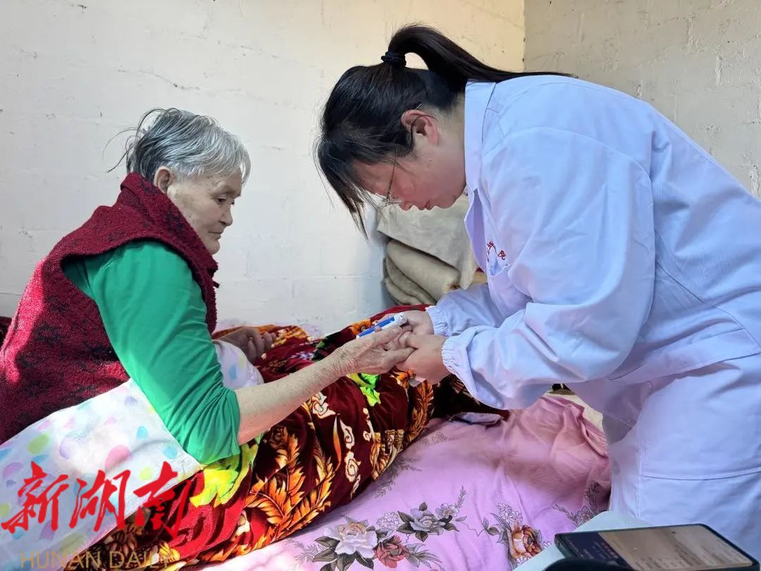 “秀芝幺幺,在家吗?”一个普通的上午,熊红艳开始了她的入户随访。77岁的孟秀芝患有高血压和糖尿病,长期卧床。熊红艳熟练地为老人测量血压、血氧,仔细检查用药情况。“幺幺,药还是按照我之前开的那样吃。”她一边叮嘱,一边帮老人把凌乱的药品重新分类整理好,临走时还不忘提醒家属及时补药。