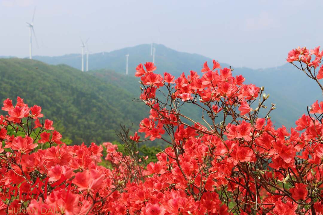 阳光下,漫山红杜鹃开得浓烈:花瓣在微风中轻轻摇曳,绿叶映衬着炽烈的红色,如火焰泼洒山间。阳光穿透花海,花影与光晕交织,朦胧中更显梦幻;山巅风车缓缓转动,银白色叶片与红色花浪相映成趣,崖壁上的花朵则倔强地扎根岩缝,在陡峭地势中尽情绽放生命的热烈。