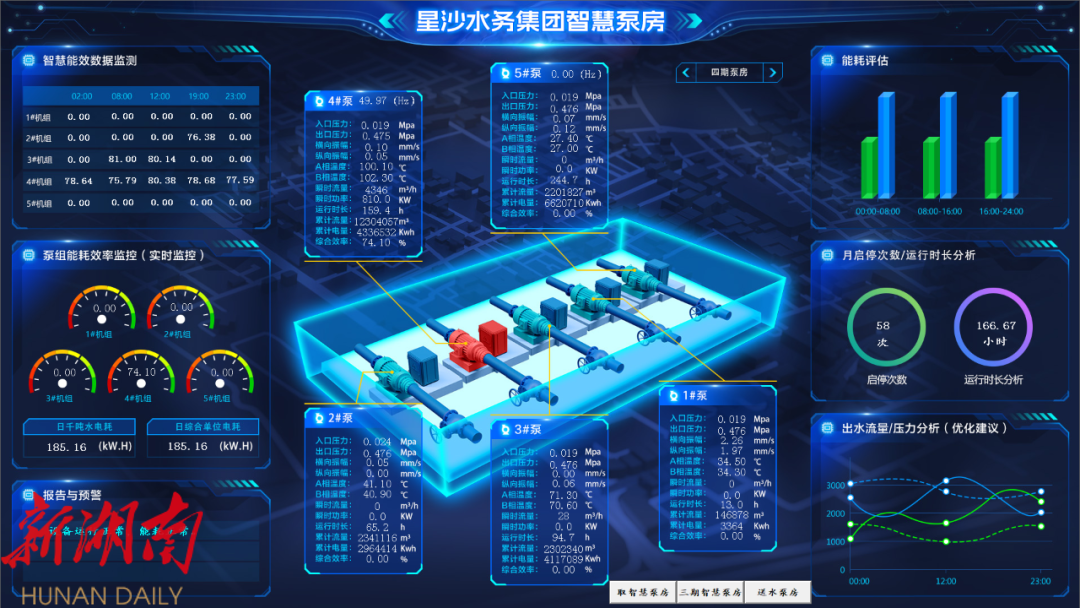 值得一提的是,星沙水务自主设计管理的智慧泵房系统,能够灵活调整泵组效率,确保其始终处于高效运行状态,同时具备远程操作、故障预警、智能调度等功能,显著提升了供水系统的运行效率和管理效能。“自来水厂运行成本中占比最大的就是电费,智慧泵房运行预计可以为我们节约10%的泵组电费。”星沙水务相关负责人介绍。