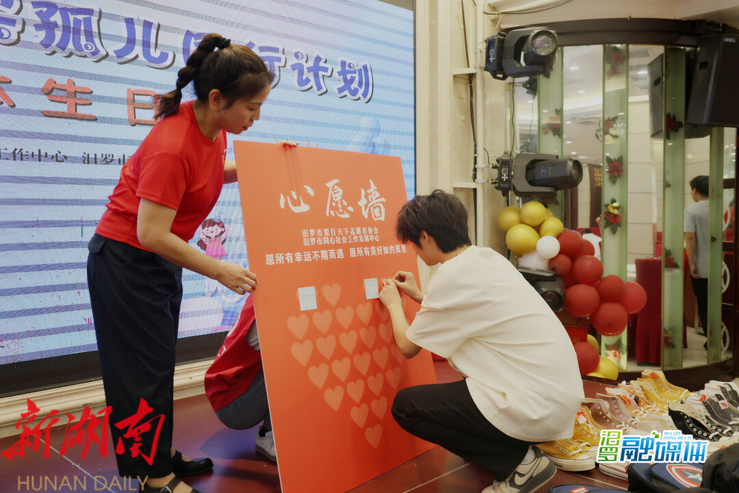 孩子们在志愿者协助下写下生日愿望贴于 “心愿墙”上