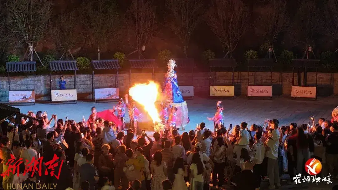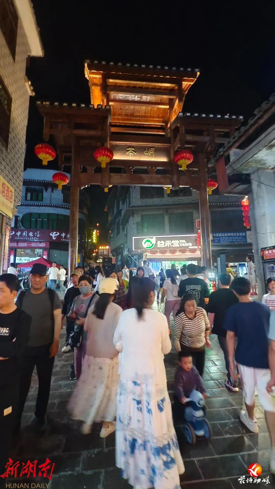 作为《边城》原型地,茶峒景区以“沉浸式文旅”为核心,推出系列创新活动。清水江上,每日两场“茶峒记忆”水上实景演出,重现小说经典片段,苗歌对唱、浣纱嬉戏等场景让游客直呼“仿佛走进书中”;新开业的“三省茶馆”还原“顺顺茶馆”风貌,苗鼓、苗歌表演座无虚席;夜幕下的天河水街,鱼灯巡游与民俗表演将文学意境转化为视觉盛宴。假期期间,茶峒景区接待游客10.62万人次,同比增长9.51%,旅游收入为178.9977万元,同比增长11.39%。
