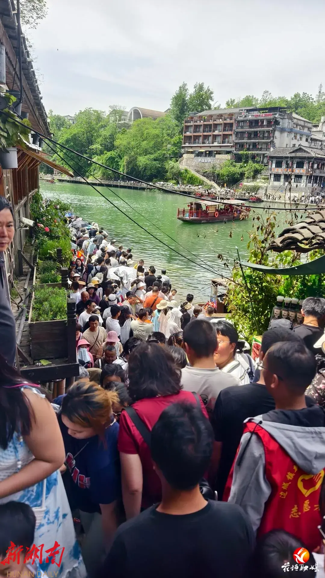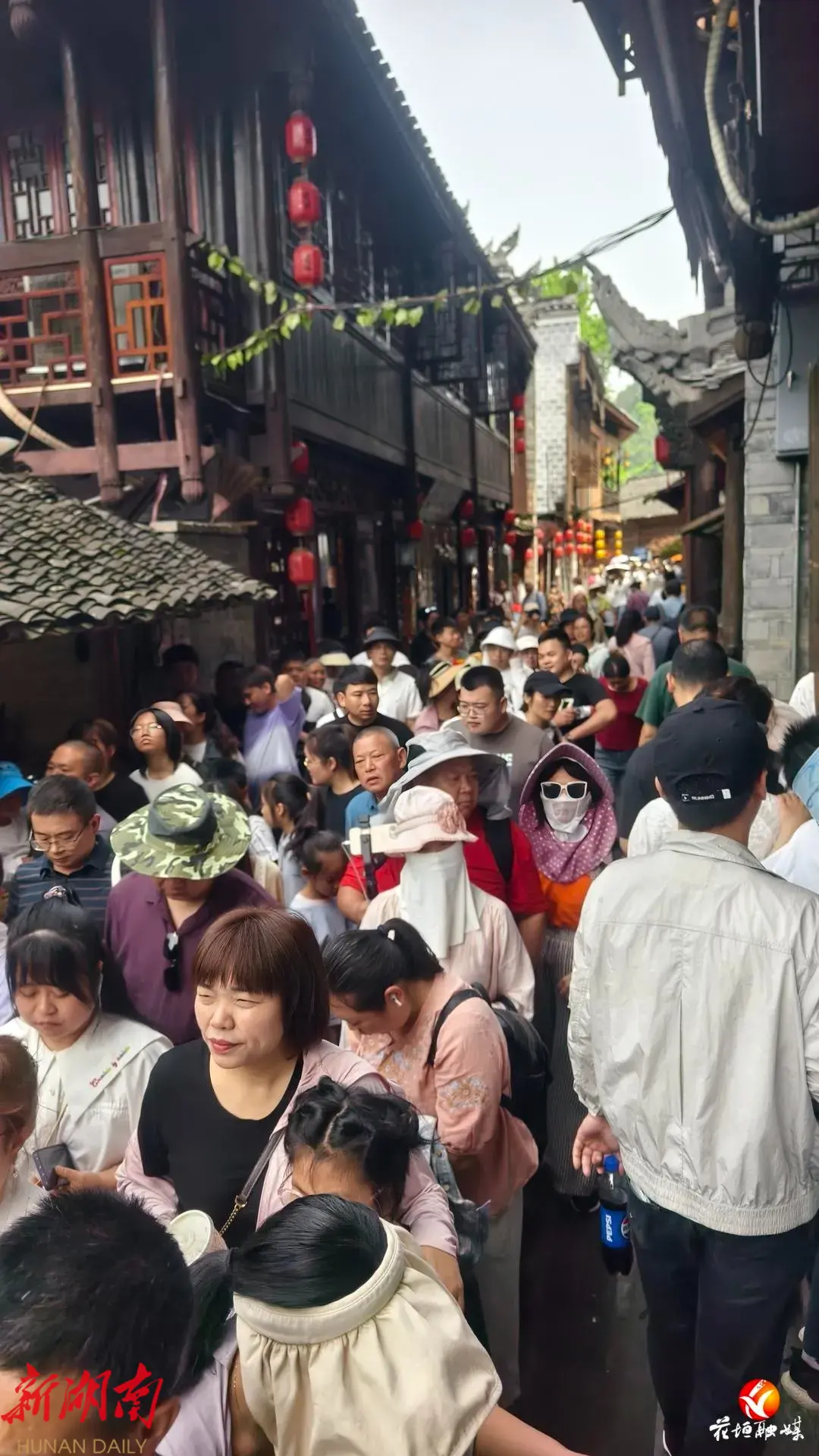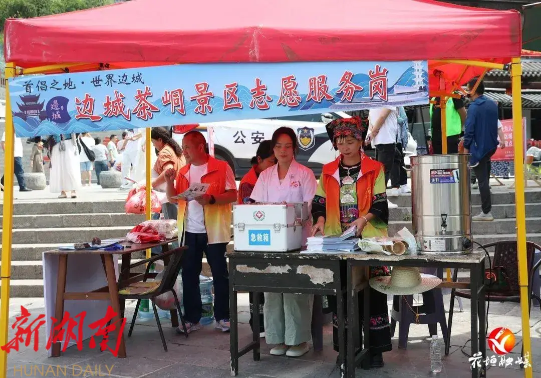 为应对客流高峰,花垣县推出系列便民举措:交警部门开放城区12条道路路边临时停车位,并拆除县城主道护栏,方便游客停车住宿,实施“首违免罚”柔性执法;在边城景区,数百名志愿者驻守7个服务站,提供导览、医疗等“一站式”贴心服务。