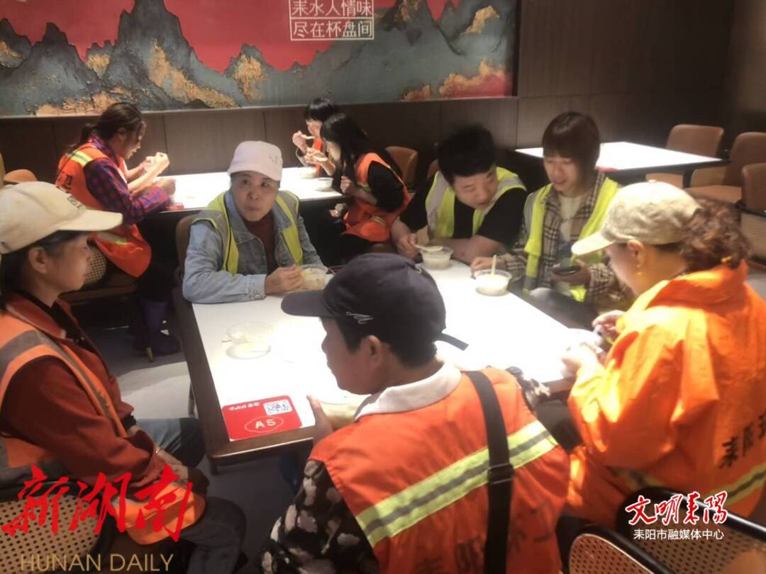 在群英南路耒水情饭店爱心服务站门前,爱心人士们将精心熬制的立夏粥,逐一递到正在街头清扫作业的环卫工人手中,同时热情邀请他们进店稍作休憩。“今天凌晨四点就出门工作了,刚好肚子饿了,喝了这碗立夏粥,心里感觉很温暖。”环卫工人黎大姐捧着粥感慨道,朴实的话语传递出这份关怀带来的切实温暖。