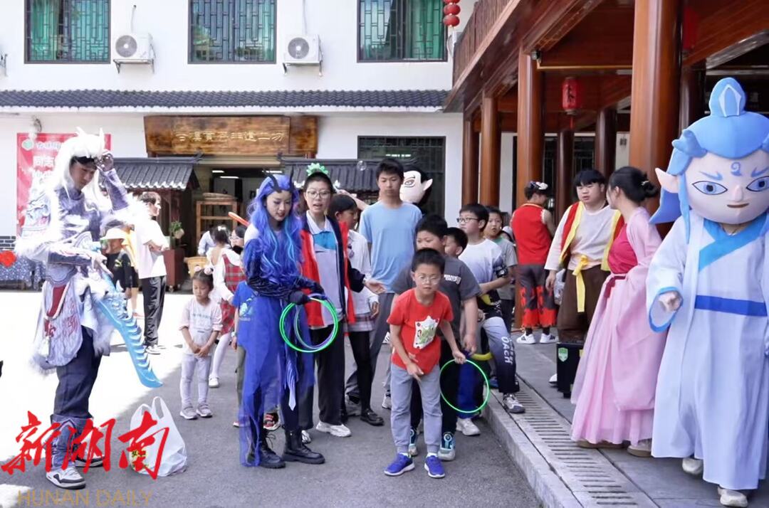 洞口县古楼驿生态文化旅游区将传统民俗与新潮艺术相结合,推出哪吒巡游茶园、国风打卡、红色旅游等活动,景区内数十名盛装打扮的哪吒、敖丙、太乙真人、申公豹在景区内与游客进行精彩互动。