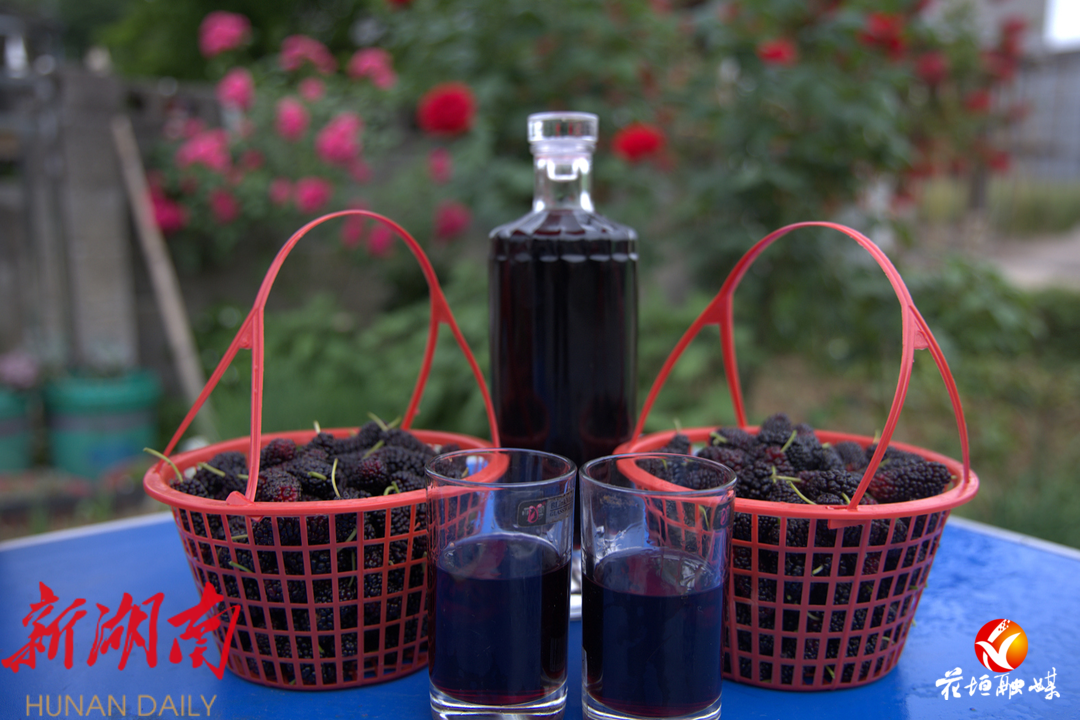 新鲜的桑葚果和农户自己酿造的桑葚酒