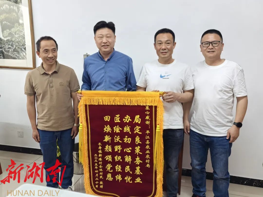 ▲新港村村支两委和村民代表送锦旗给平江县农业农村局
