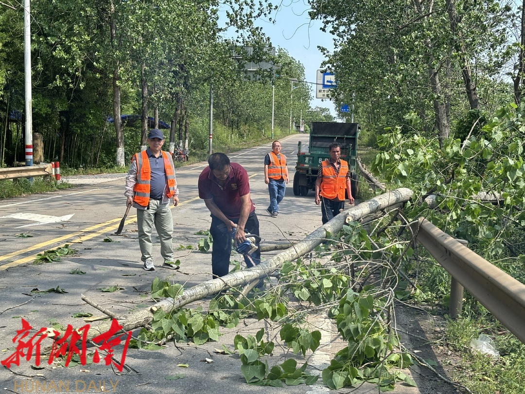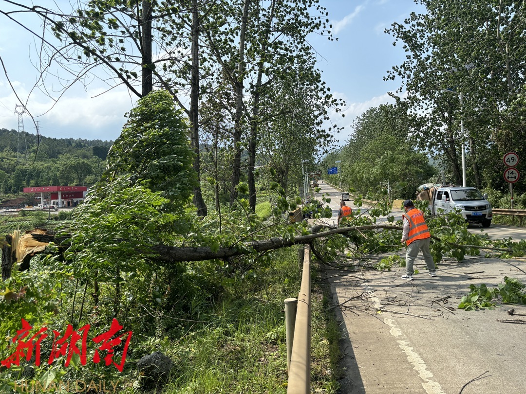 新桂阳5月8日讯(通讯员 朱政)今天,受强对流天气影响,我县遭遇10级以上瞬时大风袭击,导致S222线、S215线发生行道树倒伏。经县公路建设养护中心全力抢险,受阻路段30分钟内恢复通行。