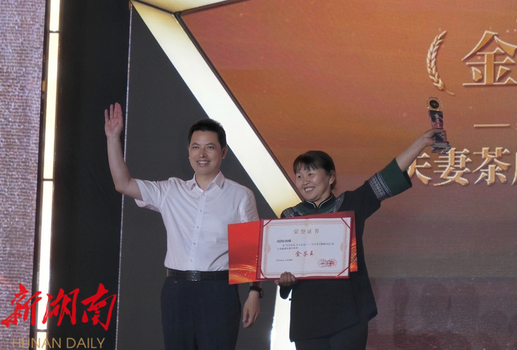 古丈县委书记滕朝辉给金茶王获奖者李清慧颁奖