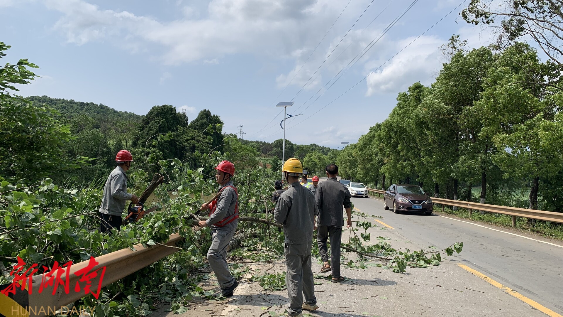 由于倒塌树木体积庞大,给清理工作带来一定困难。现场处置的党员干部分组协作,有的负责锯断树枝,有的搬运树干,有的引导交通。