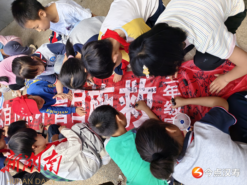 随后,全体学生在鲜红的条幅上,郑重地签下了自己的名字,以表防溺水的决心。