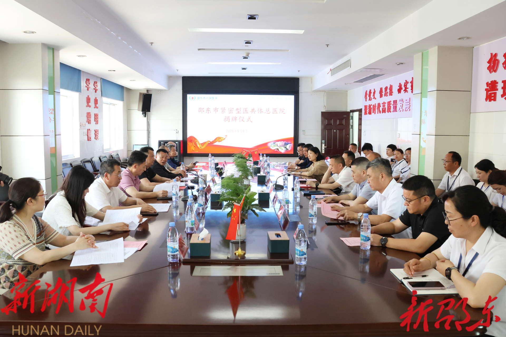 新邵东客户端5月9日讯(记者 张平华 通讯员 谢志刚 申秀梅) 5月9日,邵东市紧密型医共体总医院揭牌仪式在市人民医院举行。邵阳市卫健委党组成员、副主任范志锋,邵东市副市长谢辉伟为邵东市紧密型医共体总医院揭牌。