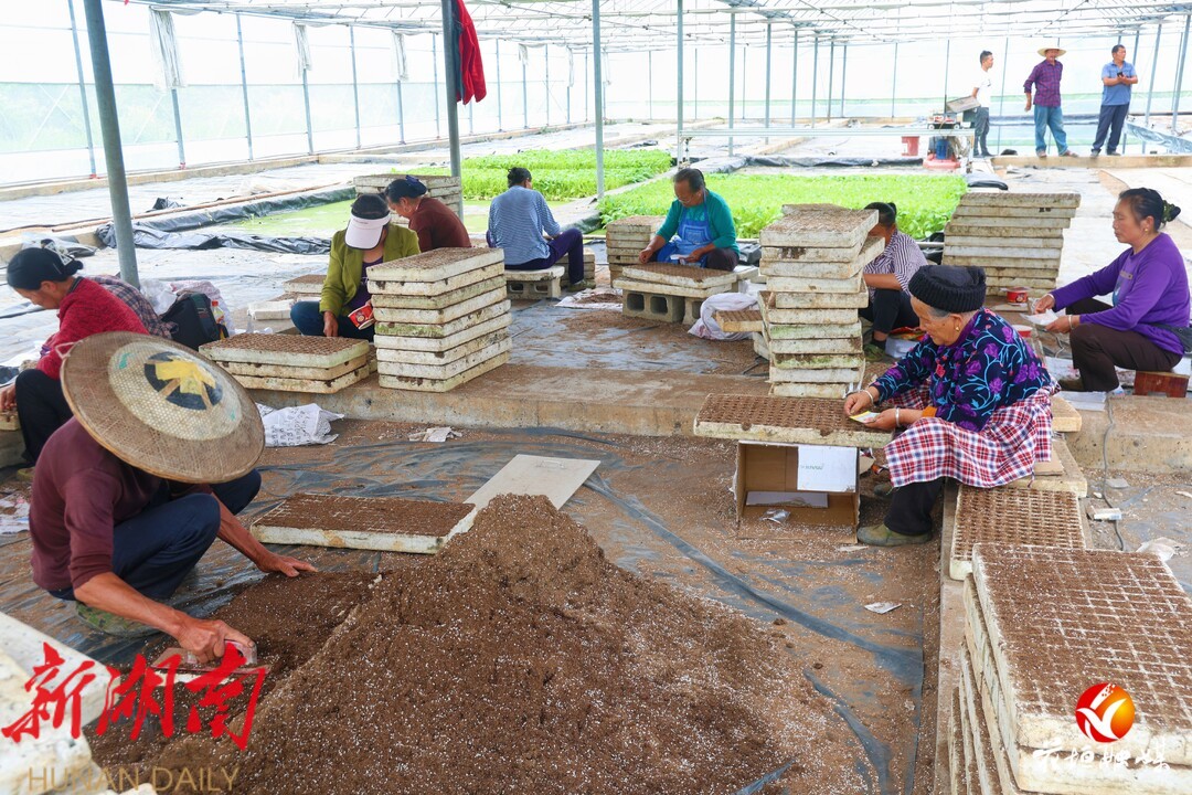 大棚内,10余名村民们熟练地进行着筛土、装盘、点播、摆盘等一系列工作,大家分工有序,动作有条不紊。