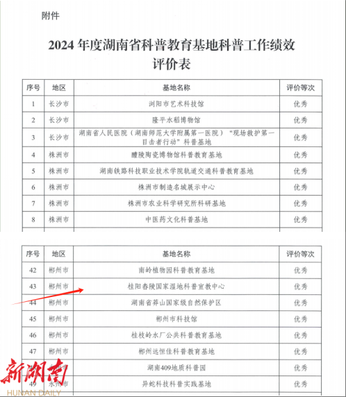 新桂阳 5 月 9 日讯 今日,《湖南省科学技术协会关于公布湖南省科普教育基地 2024 年度绩效评价结果的通知》发布,桂阳舂陵国家湿地科普宣教中心从 275 家参评单位中脱颖而出,获评 “优秀” 等次。