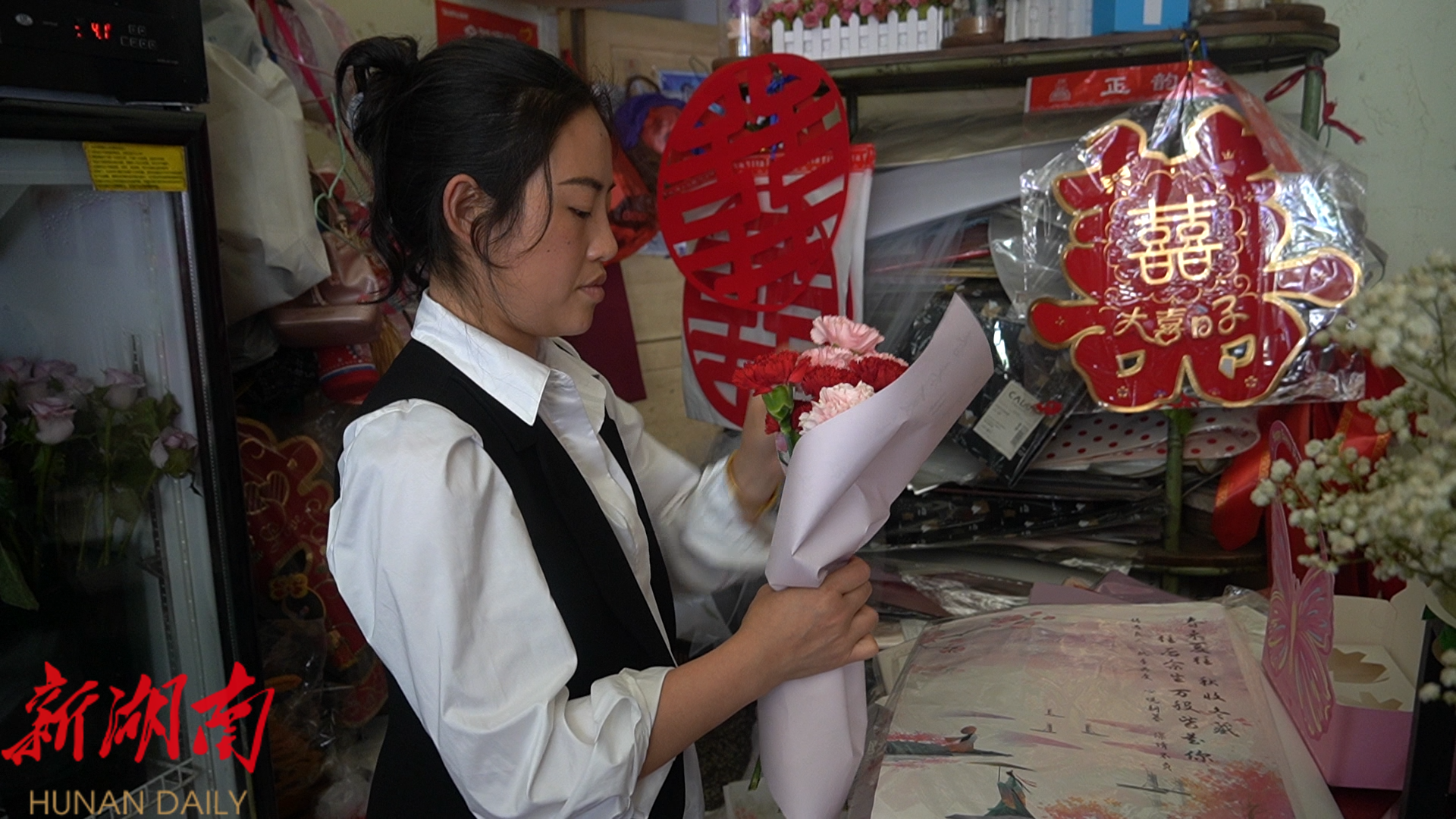 记者在城区某 花店看到,鲜艳的康乃馨、玫瑰花等热门鲜花被摆在店铺 中 最显眼的位置,方便顾客选购 , 店内工作人员 正忙着修剪花枝、包装礼盒。