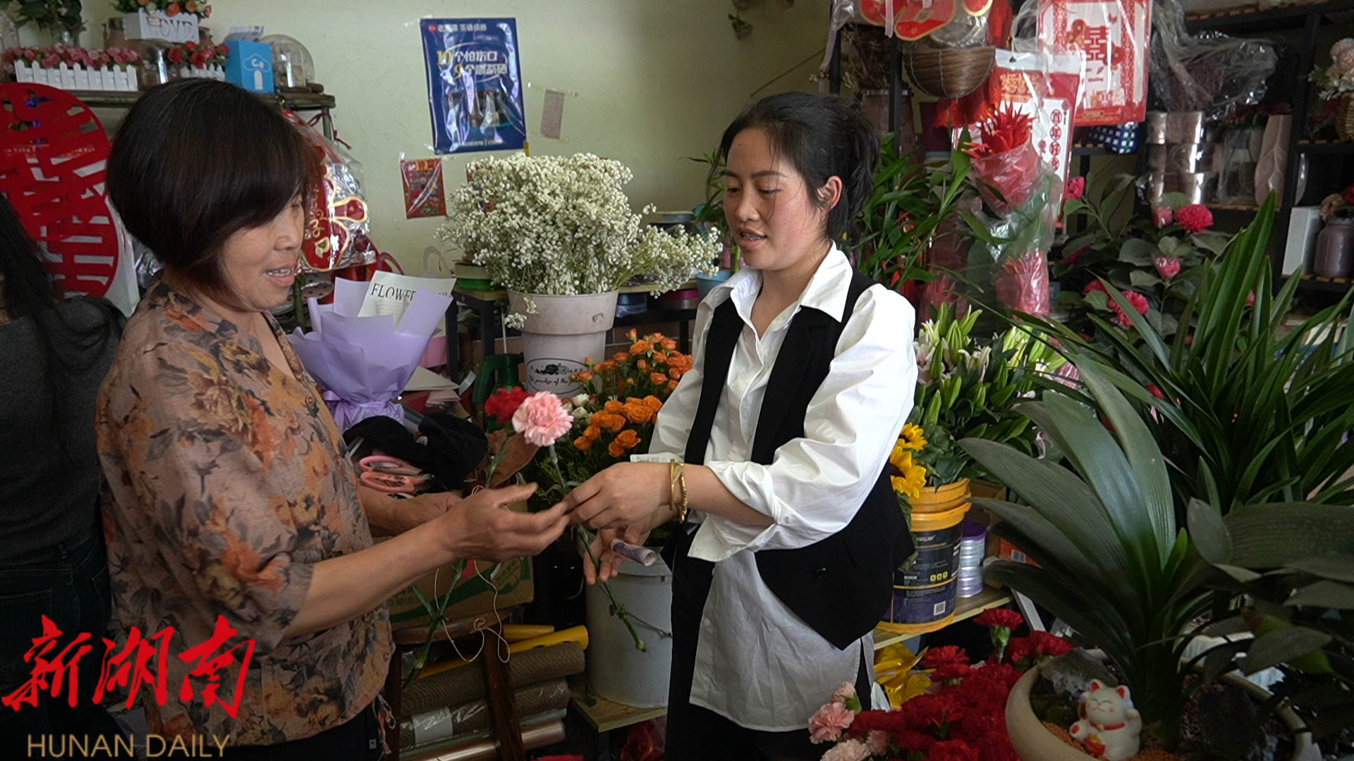 洞口融媒5月10日讯( 记者:江京晟) 随着母亲节的临近,我县鲜花市场迎来火爆升温。康乃馨、玫瑰、芍药等鲜花凭借其优雅姿态与美好寓意,成为了消费者表达爱意的热门选择,商家们加班加点备货,节日经济持续升温。