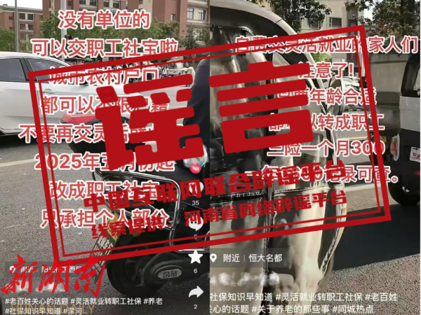 真相: 近日,河南省漯河市委网信办接到网民举报,有平台账号发布视频称“没有单位的可以交职工社保啦”“不要再交灵活就业了,2025年五月份起改成职工社保,只承担个人部分”“交灵活就业的只要年龄合适都可转成职工三险,一个月300”,引发社会关注。经漯河市人力资源和社会保障局核实,以上内容均为虚假信息。根据相关法律法规规定,灵活就业人员以企业职工身份、由企业代缴社会保险费,属于虚构劳动关系、骗取社保待遇的违法行为。请广大市民按照政策规定的要求和渠道办理社保手续,谨防上当受骗、损失钱财。(来源:“清朗河南”微信公众号)