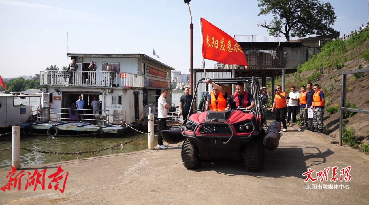 应急装备展示环节成为本次演练的一大亮点,气象灾害装备、水陆两栖车等先进防汛装备惊艳亮相。其中现场演示人员详细讲解了水陆两栖车的性能特点和操作方法,并进行了实际驾驶展示。这种两栖车辆具备卓越的机动性和多功能性,能够在行进中轻松渡过江河湖海,无需依赖桥梁或船只。近年来,它已被广泛用于城市内涝救援、灾情巡逻、抗洪救灾、防汛应急抢险以及野外救援等紧急情况,为应急救援工作提供了有力的装备支持。最后,防空防灾应急警报演练为活动画上圆满句号。鉴于耒水防洪形势严峻,有漫堤险情,市国防动员办立即启动防空防灾应急警报,持续向城区居民发出预警信号,提醒耒水沿河群众转移到安全地带。10分钟后,警报解除,演练圆满结束。