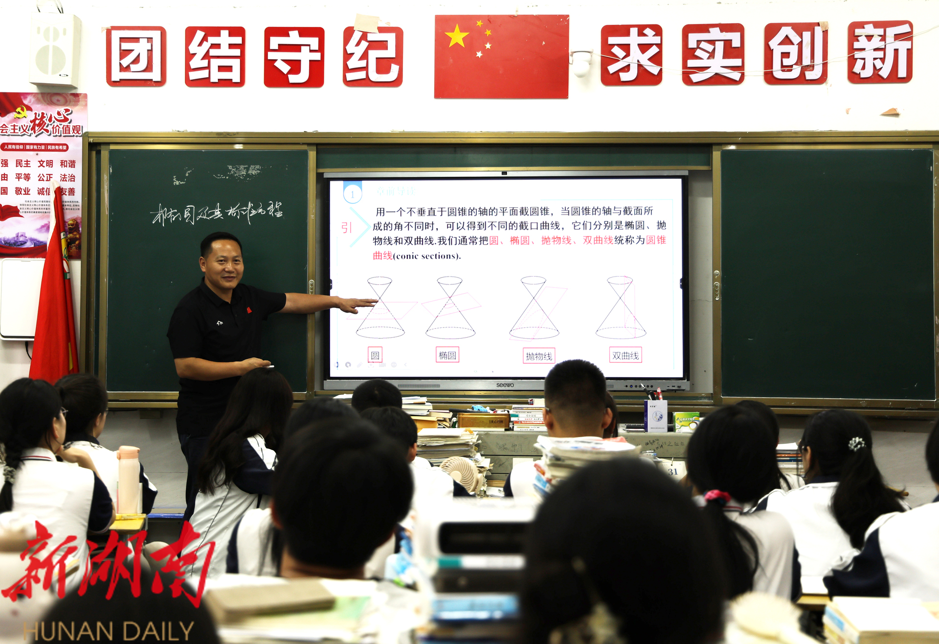 新新邵客户端5月9日讯(记者 何雯 刘丈国)5月8日,在新邵一中636班,数学老师周斌正在用PPT给学生讲解椭圆及其标准方程,他笑容可掬,讲课幽默风趣,与学生互动频繁,课堂气氛非常活跃。