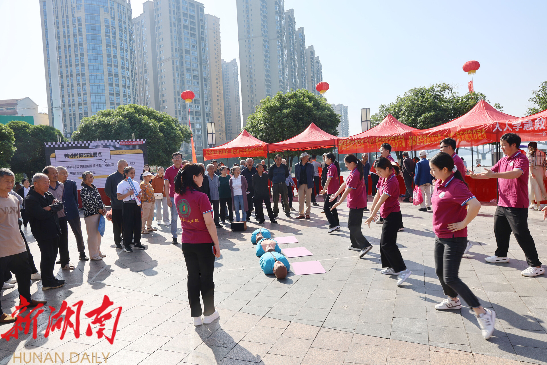 活动现场,工作人员通过搭台设点、LED电子屏滚动播放安全培训视频、悬挂宣传标语、摆放宣传展板、发放宣传资料及现场讲解、演示应急知识等形式,向群众普及自然灾害、消防安全、道路交通安全、防溺水、自救互救等防灾减灾方面的相关知识,并用通俗易懂的语言向过往群众讲解了在日常生活中用电、用气、燃气安全注意事项。活动中,来自新邵县人民医院的医护人员还现场表演了《“救”在身边》急救操,以接地气的广场舞形式,向群众普及心肺复苏的“救命”操作,让大家更生动直观地了解急救知识,提升自救互救技能。