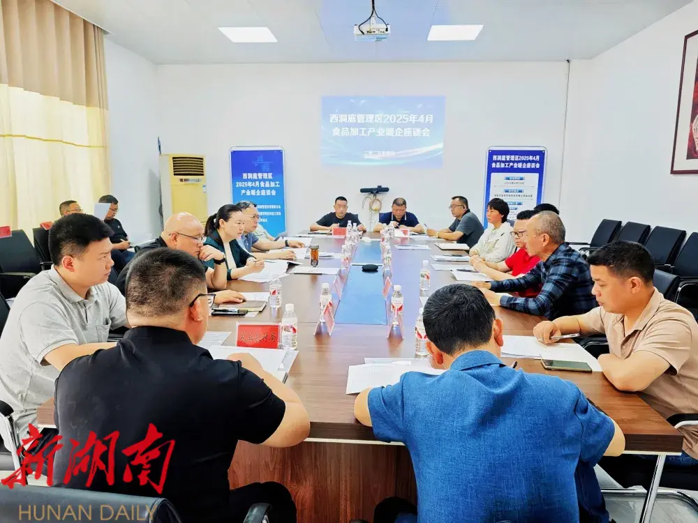 西洞庭融媒4月30日讯(记者:彭雅婷) 西洞庭管理区2025年4月食品加工产业暖企座谈会在湖南芝麻官农业科技有限公司会议室召开,面对面倾听企业诉求,为企业纾困解难,提振发展信心。区党委副书记、管委会主任叶春华出席会议并讲话,区党委委员、管委会副主任胡丹主持座谈会。
