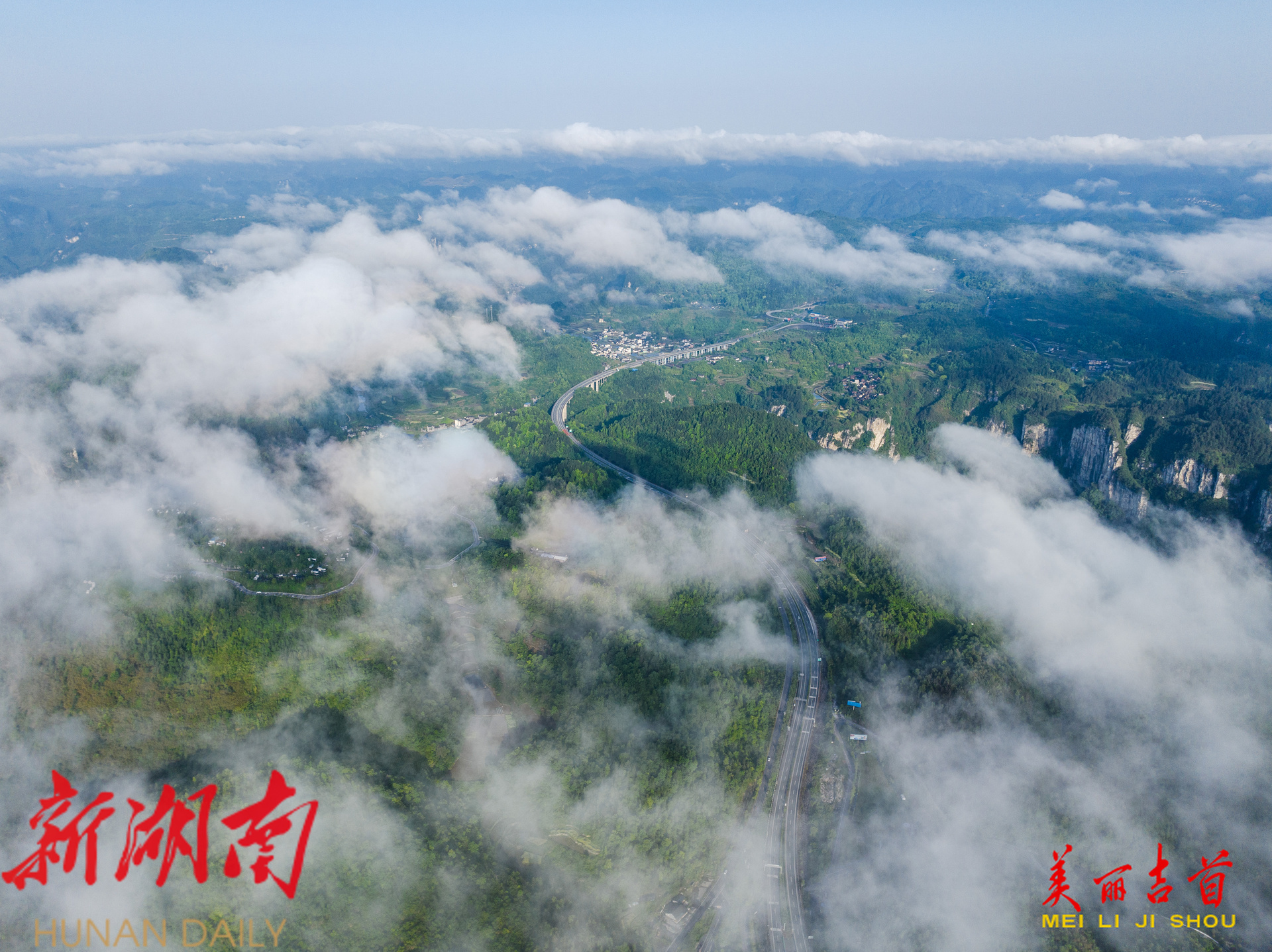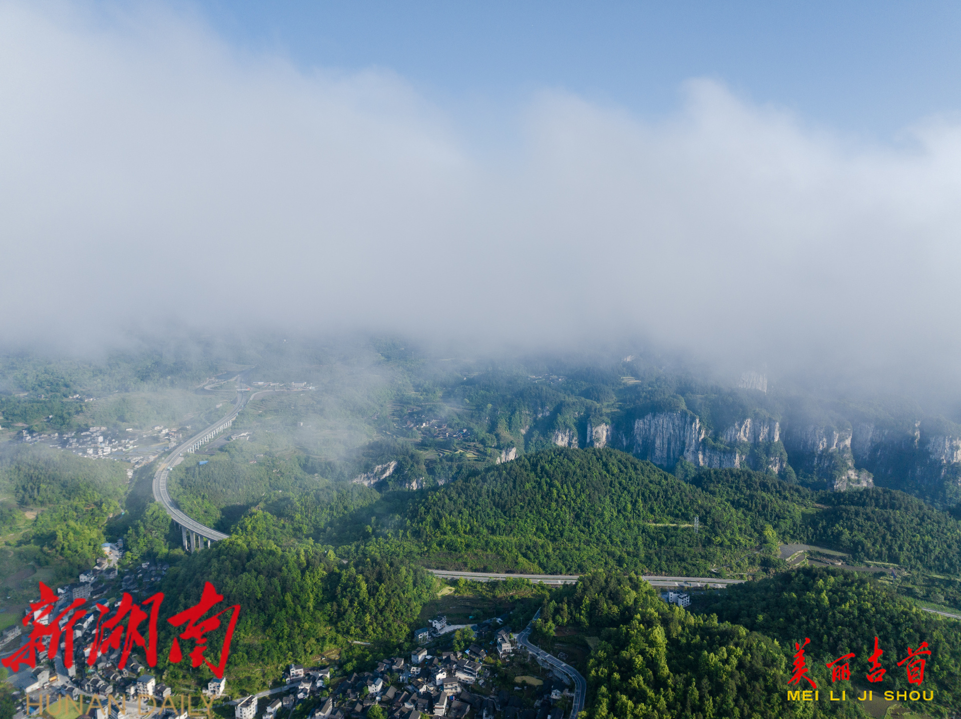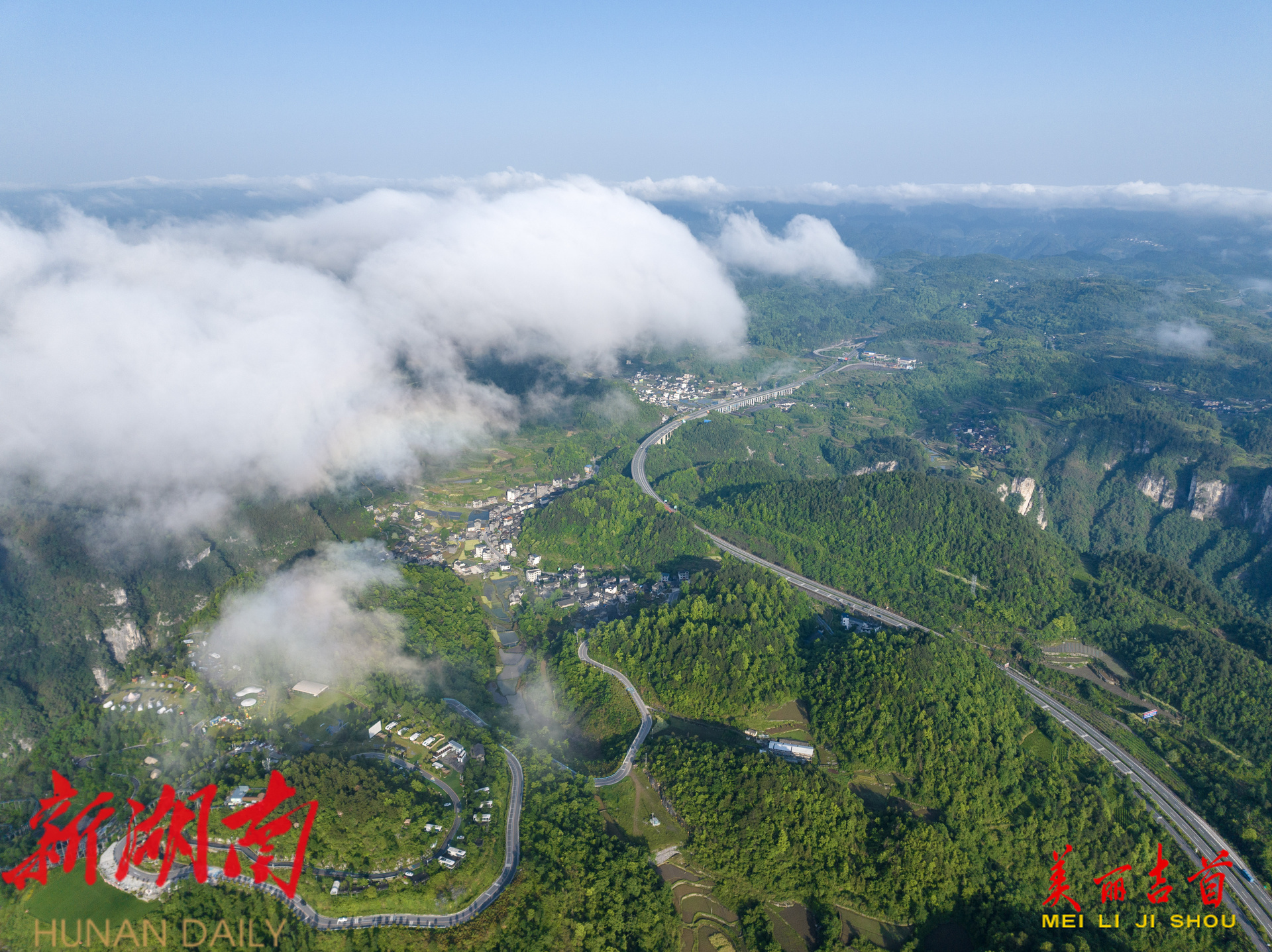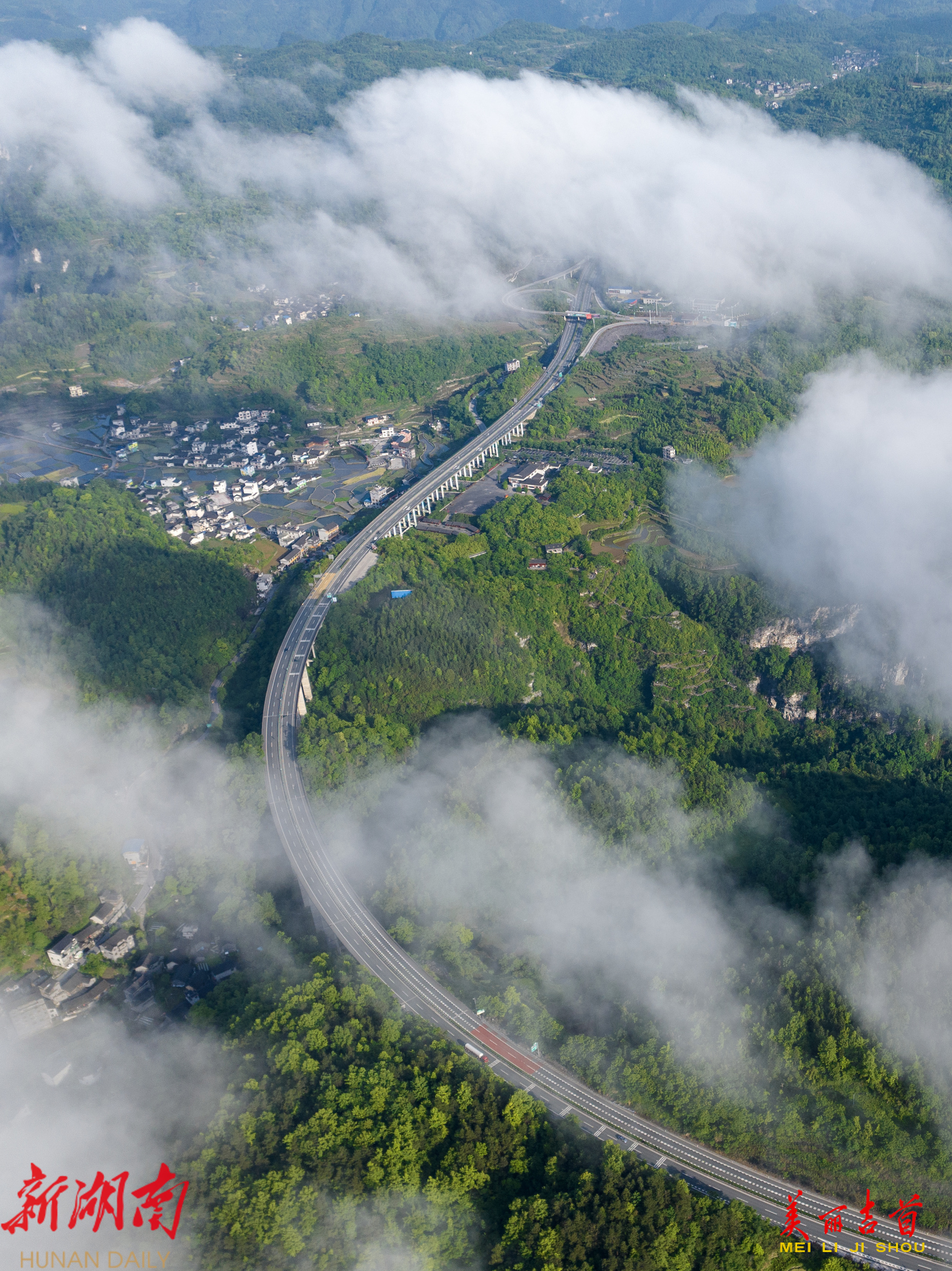 吉首市融媒体中心5月12日讯(全媒体记者 彭璟)2025年5月11日,吉首市矮寨镇幸福村附近上空云雾缥缈,蜿蜒的包(头)茂(名)高速公路穿村破雾,与苗寨、青山、峡谷相映成景,勾勒出一幅路畅景美的乡村画卷。近年来,该市加快交通基础设施建设,依托高速路网带动当地经济发展,助力乡村振兴驶入快车道。
