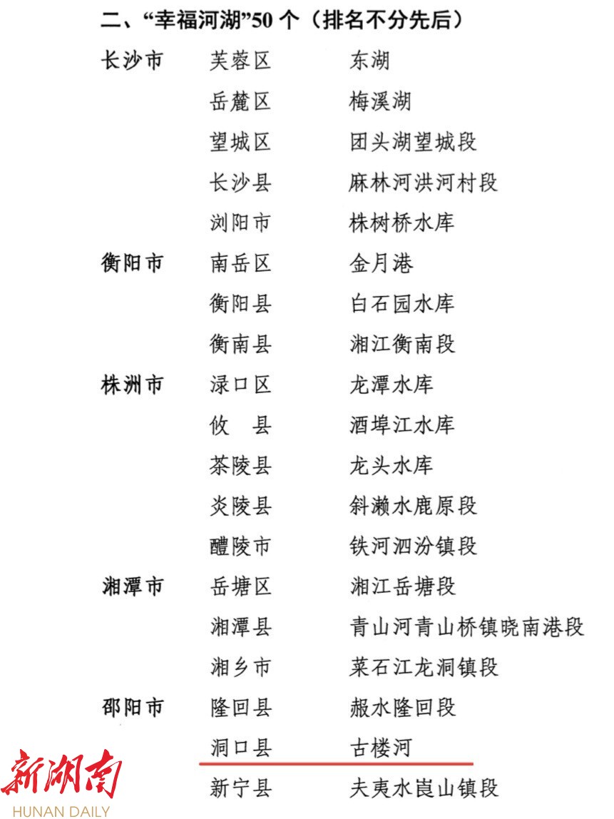 洞口融媒5月13日讯(记者:欧阳沐娟 通讯员:龙辉) 近日,省河长办公示了2024年度湖南省50个“幸福河湖”评选结果,我县古楼河上榜。