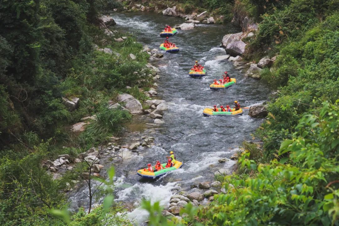永州市金洞管理区金洞国家森林公园,游客在峡谷河流上漂流