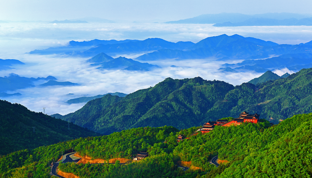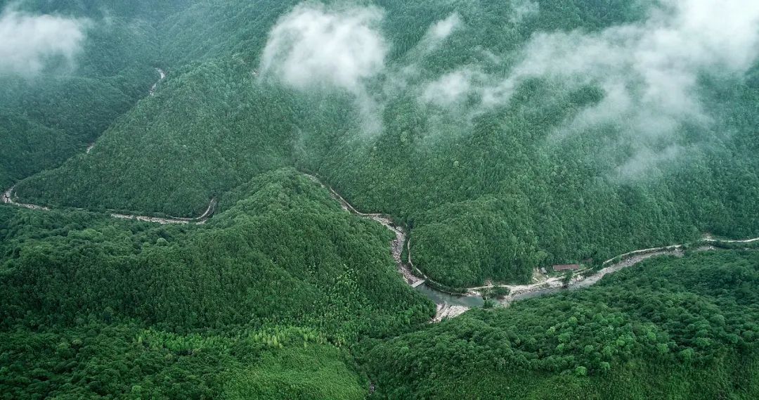 齐云峰国家森林公园,大片森林中流淌着弯弯曲曲的河流,沿河而行的公路与缭绕的云雾勾画出一幅美丽江山画卷