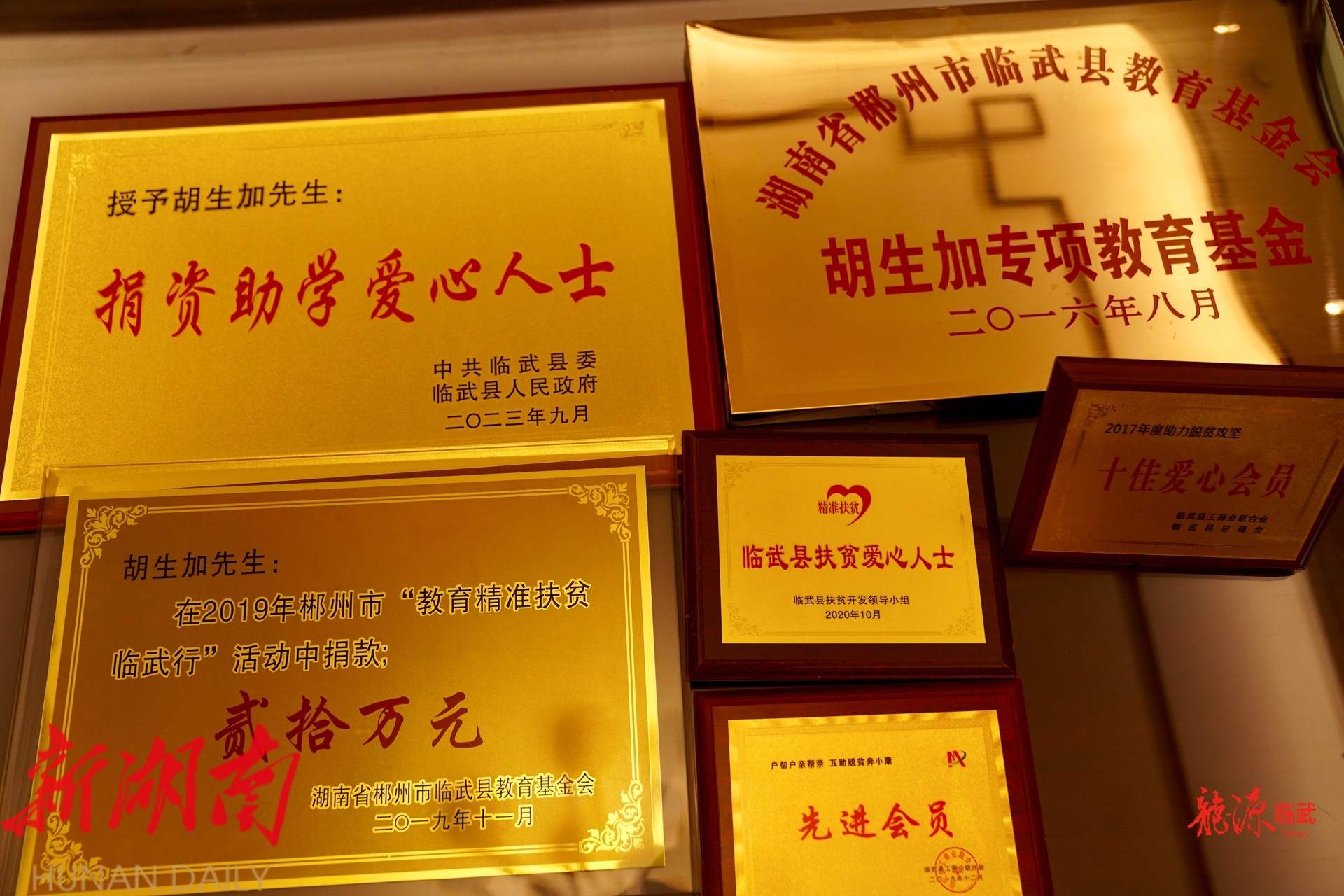 近年来,胡生加通过临武县教育基金会、临武县慈善总会、临武县好人协会、临武县新的社会阶层代表人士联谊会、临武县禾鱼小学爱心助教基金会等单位,捐资总金额近300万元,其本人先后获评“脱贫攻坚十佳爱心会员”“户帮户亲帮亲 互助脱贫奔小康 先进会员”“临武县扶贫爱心人士”“捐资助学爱心人士”。