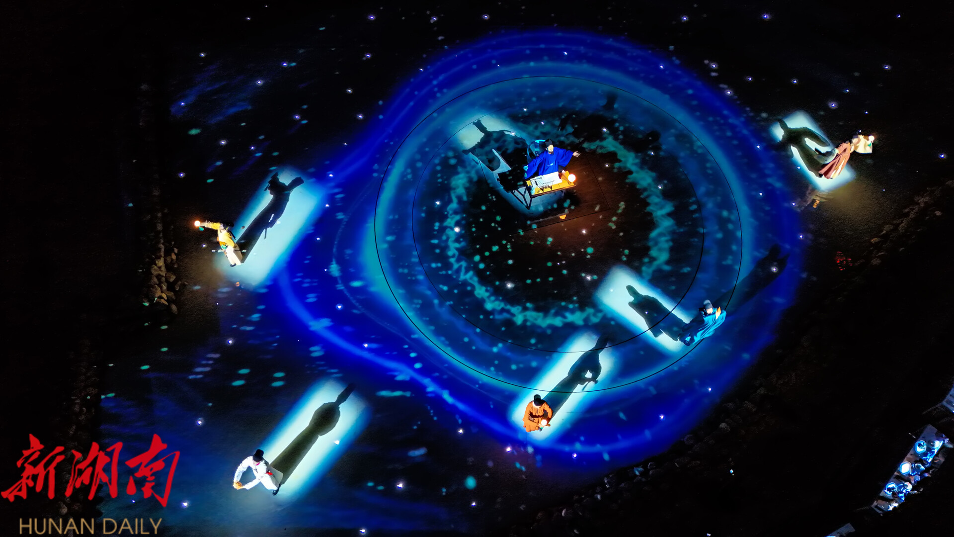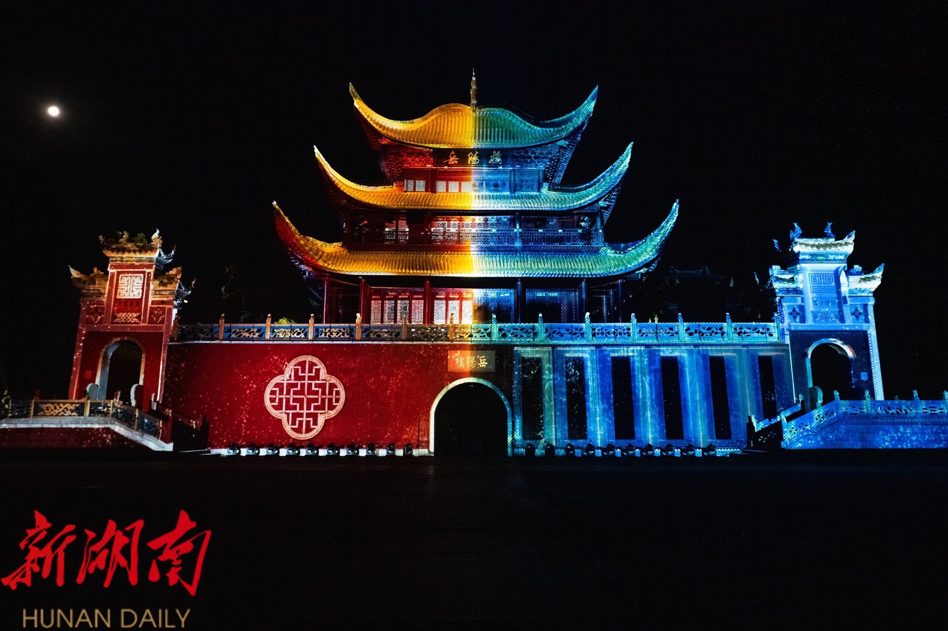 夜幕降临,岳阳楼景区光影点亮,表演拉开帷幕,穿越千年的文化之旅正式开启。