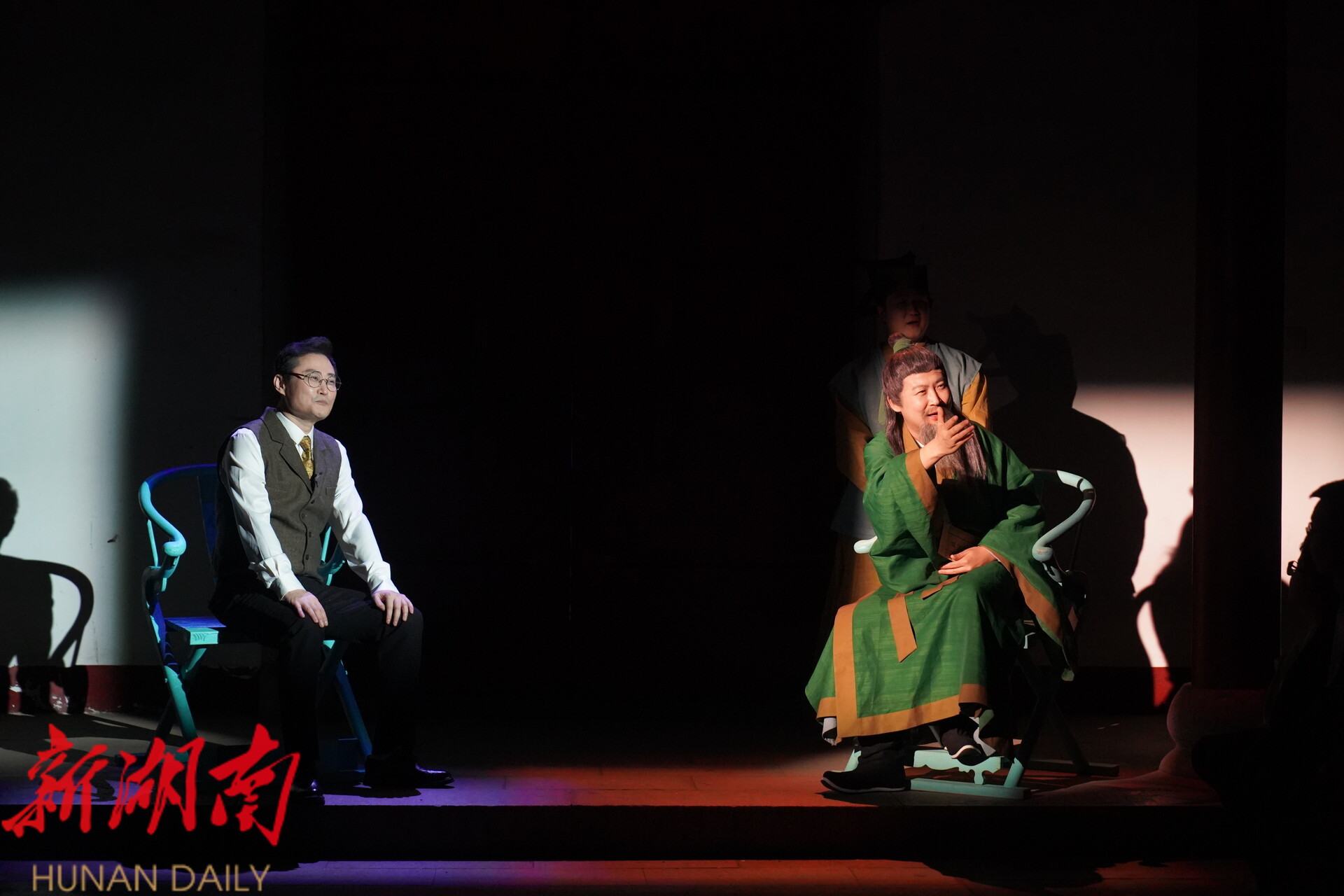 进入双公祠的“两地求记”剧场。来自省话剧院的知名话剧演员王峰倾情演绎来自现代的读书人,与来自北宋滕子京开启古今对话,戏剧化地还原了滕子京重修岳阳楼后,力邀范仲淹撰写《岳阳楼记》的背后故事。