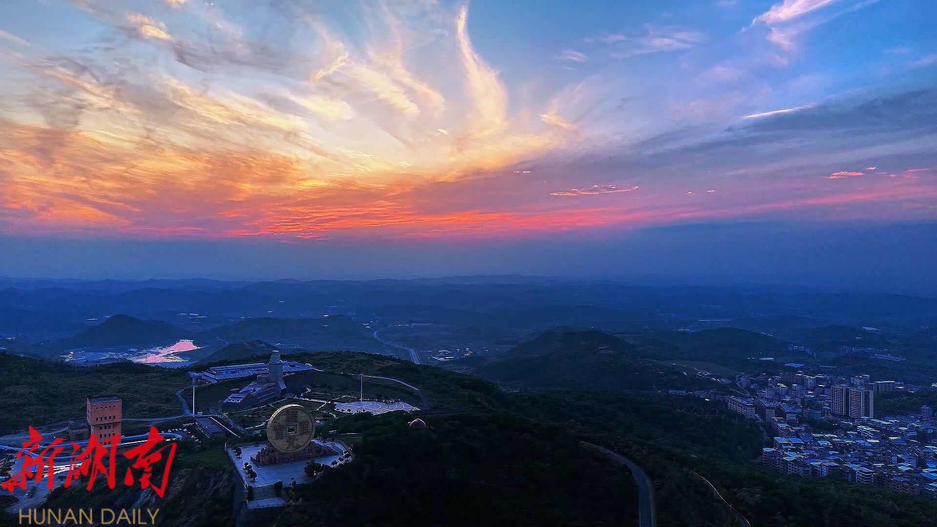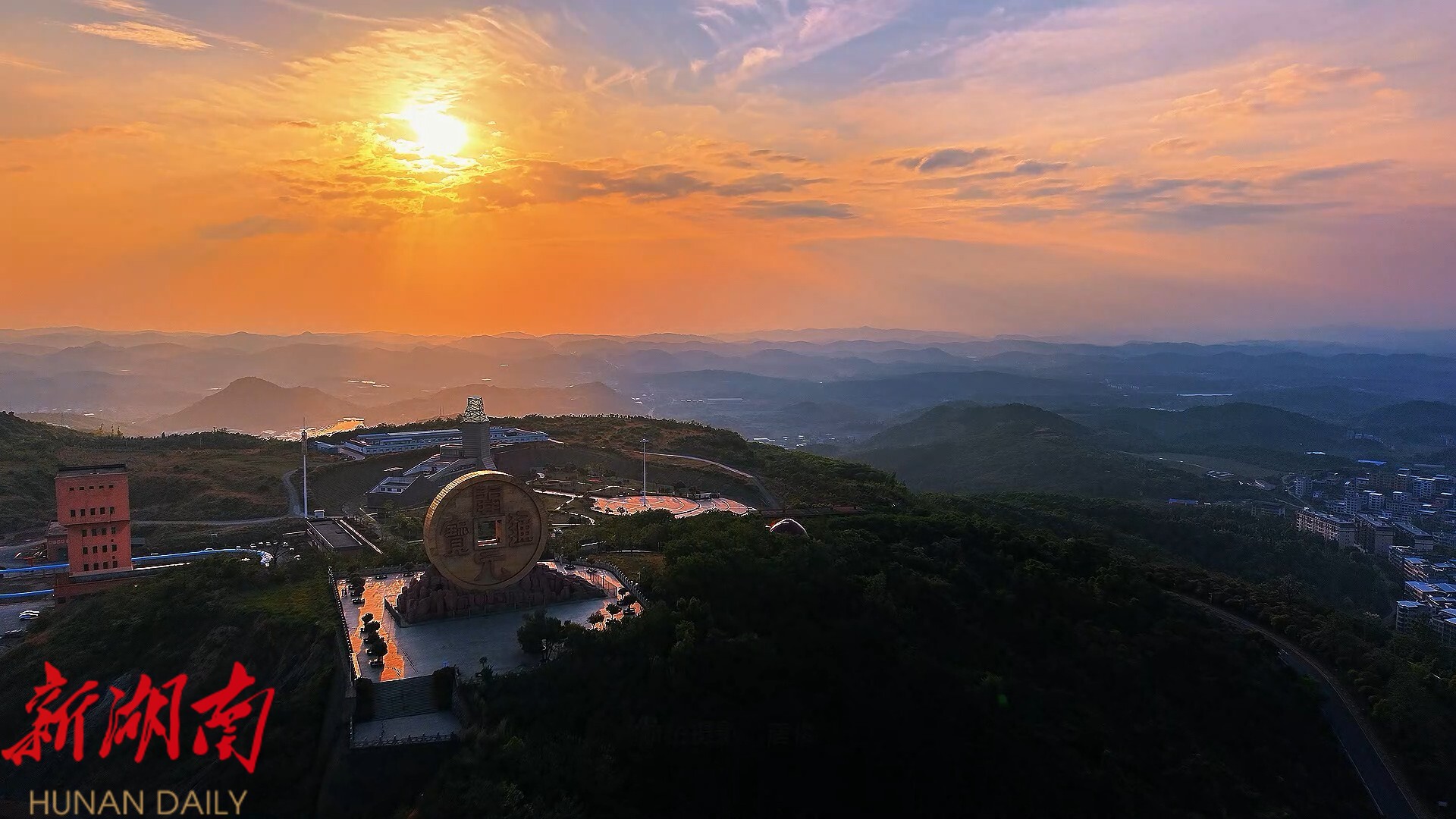 新桂阳5月14日讯(记者 陈勇 航拍 唐俊) 日前,随着夕阳西下,湖南宝山国家矿山公园内,巨大的铜钱币雕塑——“桂”字开元通宝在夕阳的映照下显得格外壮观。随着流云飘动,金色的流云与铜钱币雕塑时而呈现出龙凤呈祥、时而展现出霞光万丈等奇妙景观,让人叹为观止。