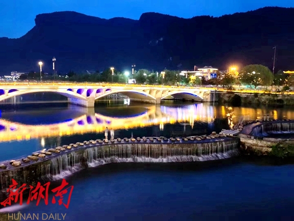 夜幕降临,索溪河两岸的生态廊道灯光璀璨,市民们在亲水步道上散步健身。作为城市更新的标志性工程,武陵源以“绣花功夫”推进市政提质。