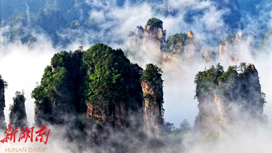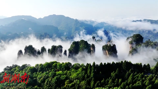 湖南日报·新湖南客户端5月13日讯(通讯员 邓道理)近日,张家界国家森林公园雨后放晴,空气清新,黄石寨景区六奇阁、摘星台、五指峰一带清晨在初升太阳照耀下,云海翻滚,山峰仿佛漂浮在空中,令到访游客纷纷发出尖叫的赞叹声。