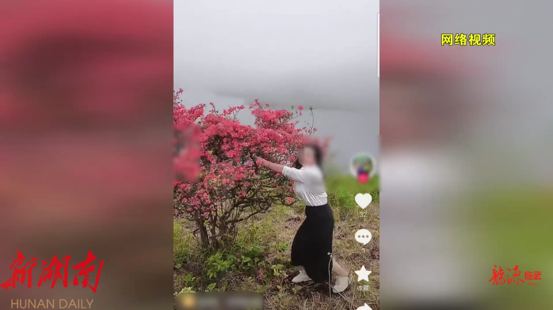 龙源临武客户端5月14日讯(记者 雷婉婷 邓圣立)近日,临武县西瑶绿谷国家森林公园天鹅塘景区的千亩高山野生杜鹃迎来盛放季,然而,社交媒体曝光的游客不文明行为却令人痛心。多段视频显示,为拍摄“花瓣雨”效果,游客剧烈摇晃树干、攀踩花枝,导致这棵70年树龄的杜鹃遭受严重损伤。