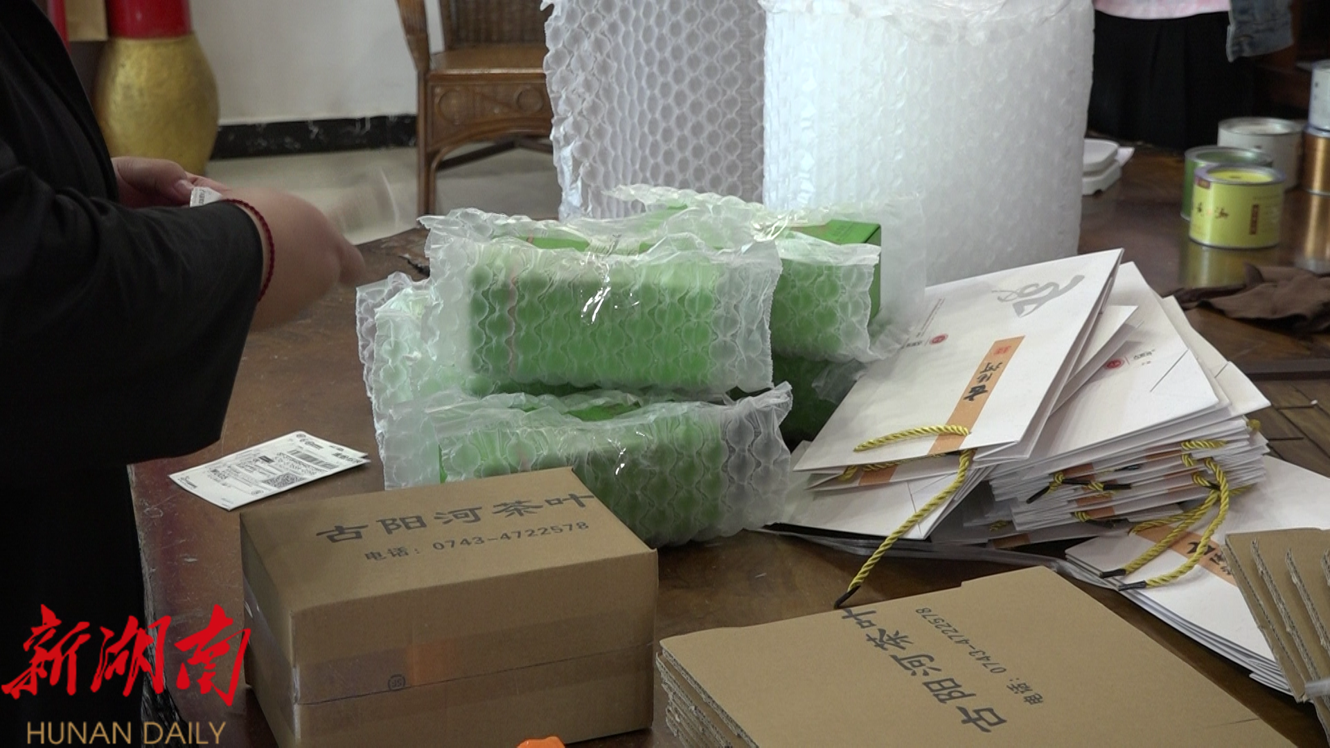 新湖南客户端5月14日讯(通讯员 杨文馨)5月13日,在湘西土家族苗族自治州古丈县古阳河茶业有限责任公司的店里,员工们正在将一盒盒品质上乘的古丈毛尖茶样打包贴标,这些茶样将在未来几天内进入全国22个高等制茶院校的研究室。