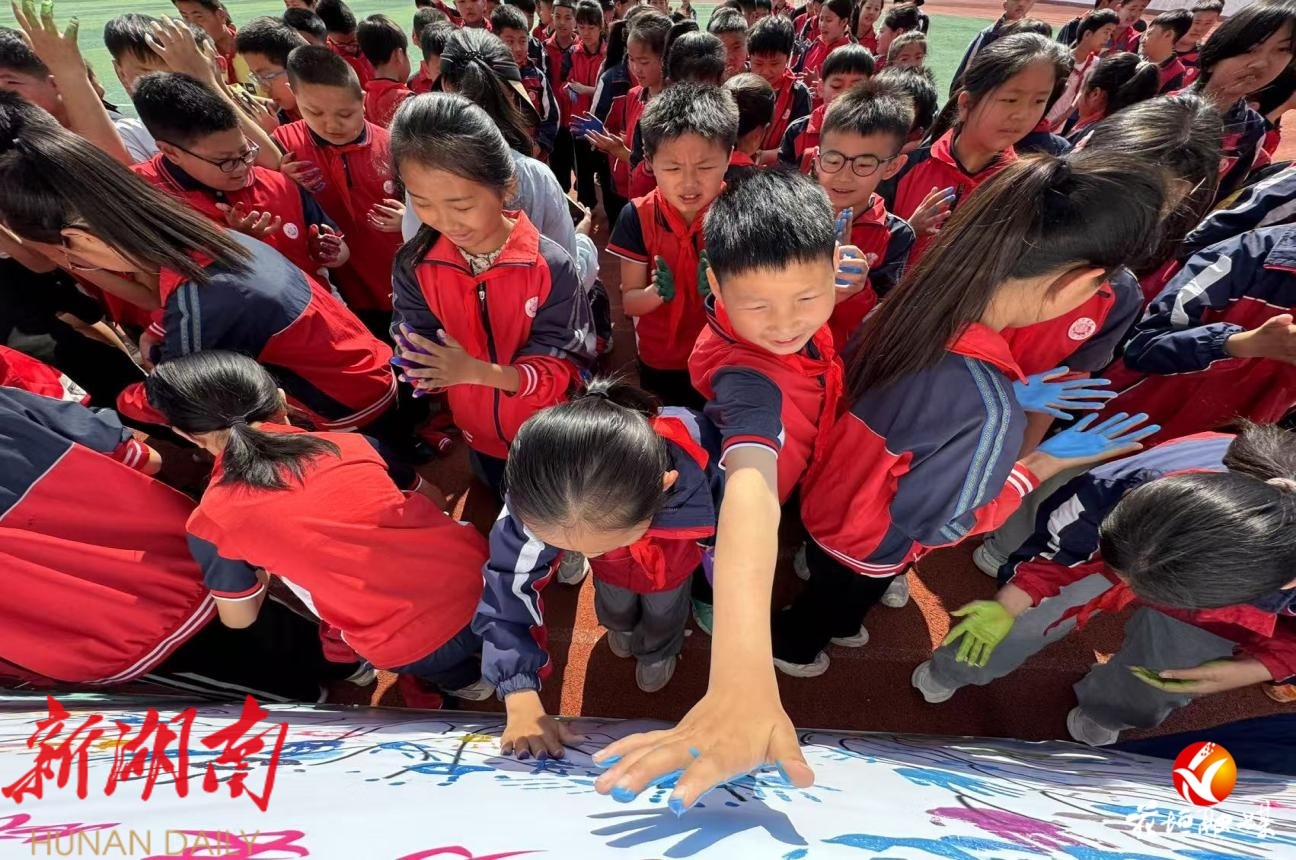 启动仪式特别设置了“爱的双向奔赴”互动环节,全体学生通过击掌或拥抱的方式与老师进行暖心互动。在五年级组开展的“快乐掌纹印画”活动中,学生们用彩色颜料在掌心作画,共同创作出一幅五彩斑斓的掌印画卷,现场气氛热烈欢快。师生们在轻松愉悦的氛围中体验心理健康教育的魅力,为后续系列活动拉开了精彩序幕。