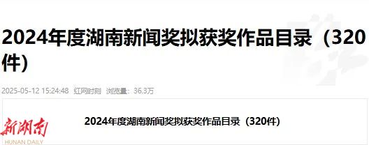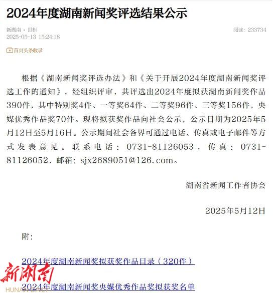 湖南新闻奖由中共湖南省委宣传部、湖南省新闻工作者协会主办,每年评选一次。2024年度湖南新闻奖拟获奖作品390件,其中特别奖4件、一等奖64件、二等奖96件、三等奖156件,央媒优秀作品奖70件。