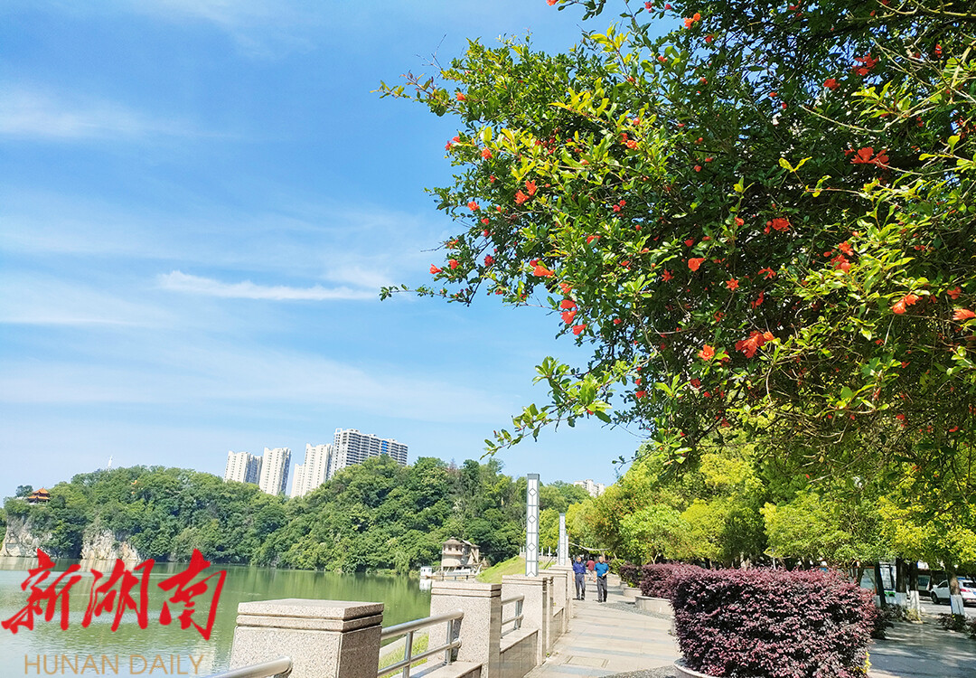 新新邵客户端5月15日讯(记者 何雯)5月14日,漫步在新邵县的资江风光带、街头巷尾、庭院村落,随处可见一树树火红的石榴花热烈盛开。在绿油油、亮铮铮的榴叶间,一朵朵火焰般的小红花挂满枝头,如同旧年未拆的胭脂匣突然被打翻,层层胭脂溅在了叶脉间,连阳光漏进来,都染成了流动的琥珀。
