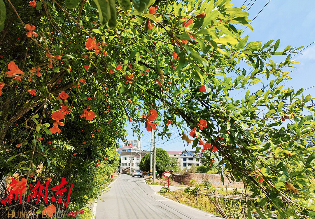 有人说,石榴花是蘸着朱砂写的信,风一吹,就掀开了初夏的第一页。满树的红焰与湛蓝的晴空、飘逸的白云、精致的房舍、清澈的江水相互映衬,成为新邵大地上一道不可错过的初夏美景。