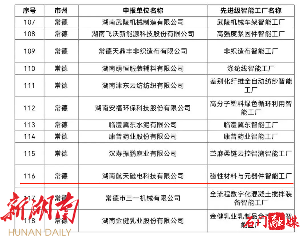 新石门客户端5月16日讯(记者 牟宇飞)近日,湖南省工信厅公布了2025年度全省先进级智能工厂拟认定名单,常德12家企业入围,其中,湖南航天磁电科技有限公司申报认定为磁性材料与元器件智能工厂,彰显出常德在制造业智能化转型中的强劲实力。