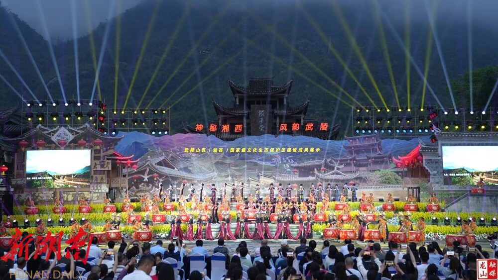 夜色渐浓,“神秘湘西·风韵武陵”武陵山区(湘西)国家级文化生态保护区建设成果展示在惹巴拉宫继续上演。