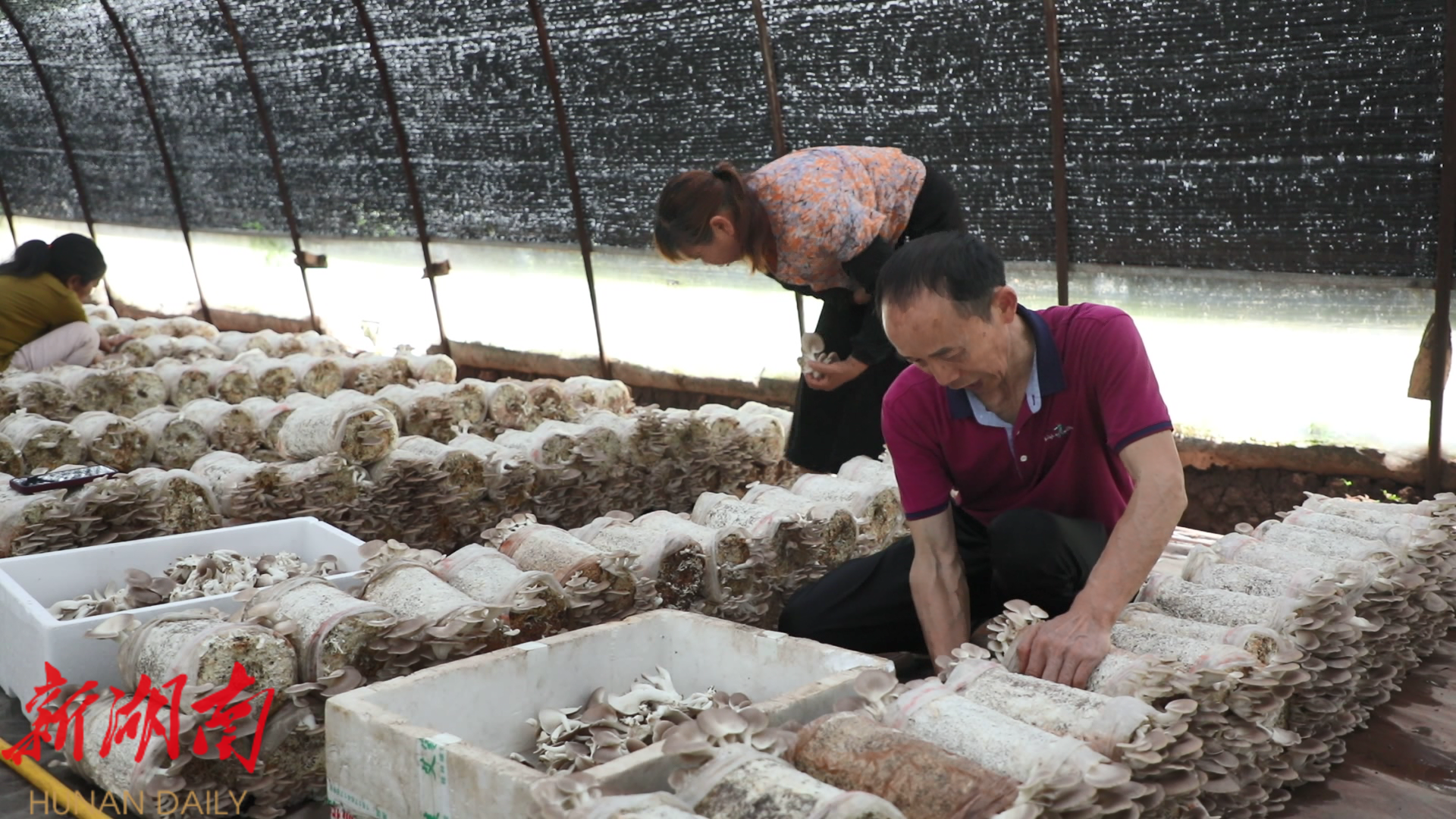 永兴新鑫食用菌种植专业合作社负责人王宝泉:“现在,我们主要是使用机械化作业;比如装包,主要用全自动机器装袋,再放在架子上高温杀菌后,工作人员再搬出来给它接种,之后,再放到菌棚里面,发了菌丝后再给它出菇。”