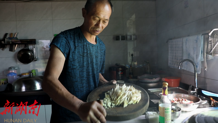 时近正午,臧波将刚采的藕根细细切段,热油轻炒间清香四溢。专程从益阳返乡探亲的兄长臧明灿 和家人们端坐 在枇杷树下, 一桌子的美食,却频频夹起白皙的藕根。