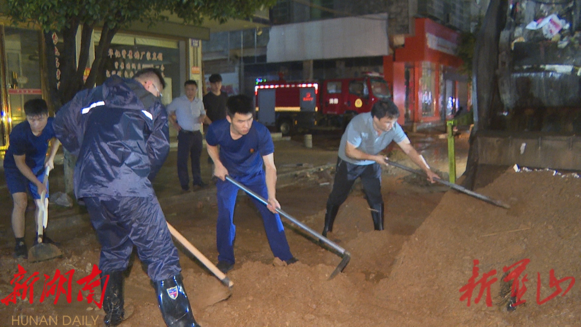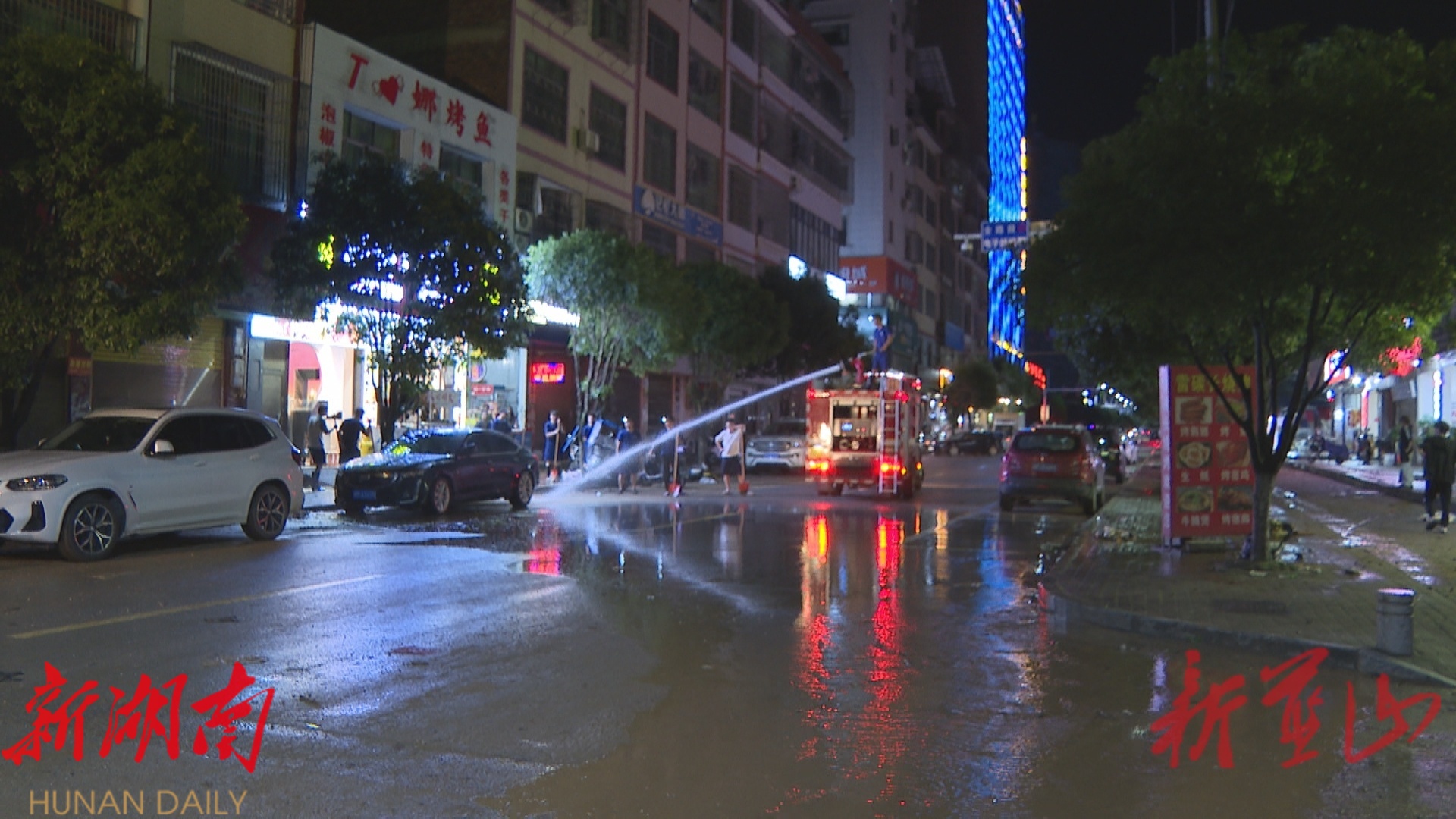 当天晚上11点许,蓝山县政府办联合塔峰镇、县应急管理局、县城市管理和综合执法局、交管大队等部门组织60余名党员干部在县城边贸中路对道路退水后进行全面清理。从现场可以看到,道路中间和两旁都堆积不少淤泥,党员干部们正低头弯腰,利用铁锹等工具,齐心协力地将覆盖在道路上的淤泥清理干净。针对积水低洼路段,党员干部利用高压水枪冲刷加速排水,清除淤积泥沙、落叶等堵塞物,保障排水系统畅通无阻。经过近两个小时的“人工+机械”紧密配合作业,路面清淤工作顺利完成,迅速恢复了往日的干净和整洁。次日凌晨1时左右,道路解除临时管制,恢复通车。