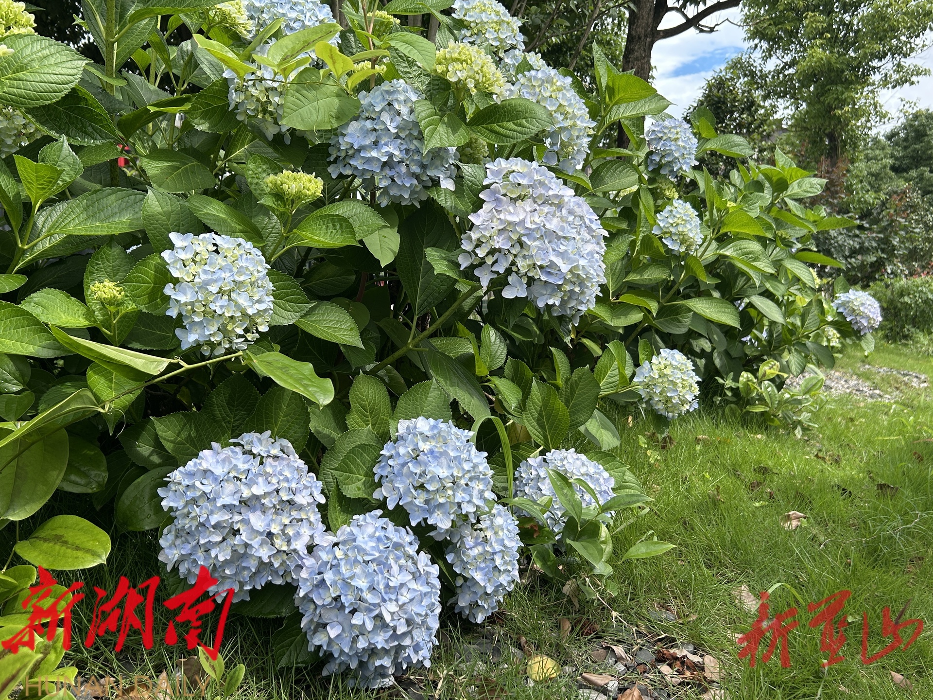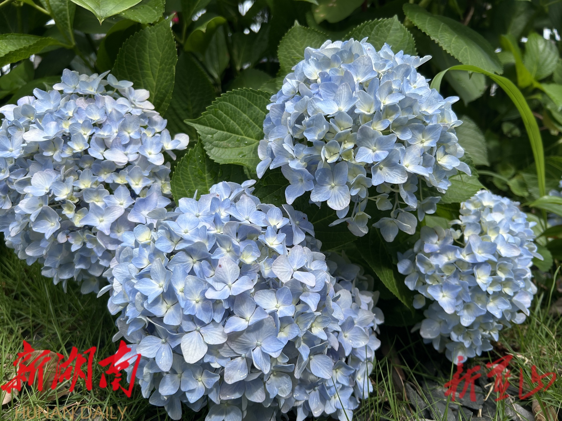 步入花丛,只见绣球花一团团、一簇簇绽放,花型饱满、硕大美丽,红的热烈、蓝的静谧、紫的温柔,星星点点的小碎花朵朵成团,簇拥在椭圆形绿叶之中,交织成一幅绚丽的“调色盘”。微风拂过,花香四溢,漫步其中,行人能尽情享受这份初夏的浪漫与宁静。