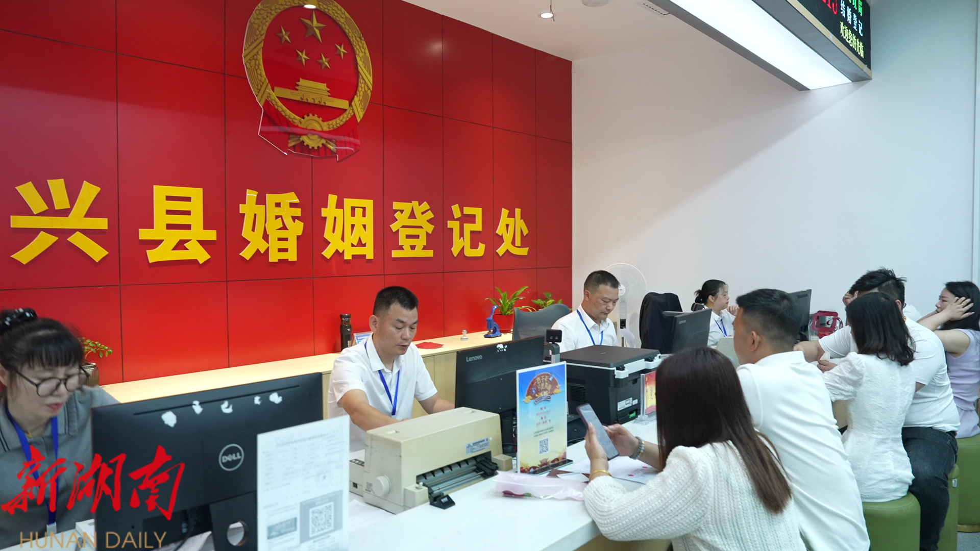 新婚登记人谢珊珊:“我们是外地人,现在是在永兴工作。现在可以异地领证了,我们想趁着520这个的甜蜜节日来领证,一起过个甜蜜的520。”