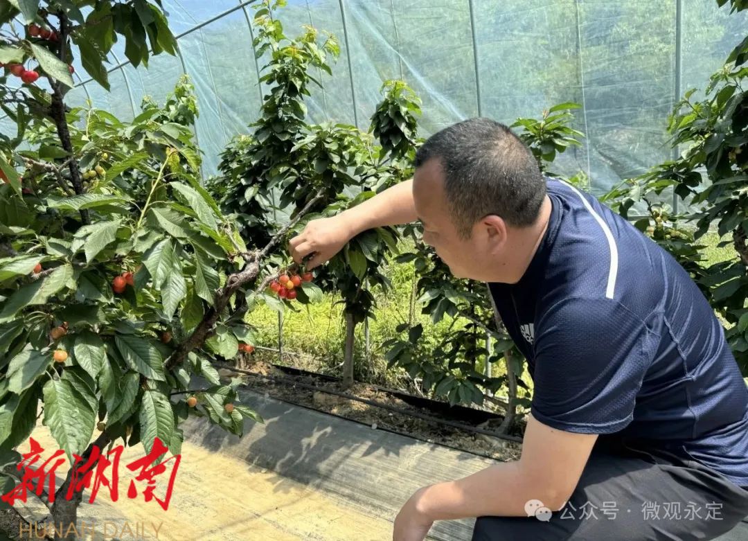 “我们从2022年就开始尝试种植车厘子,当时很多人都觉得这是‘异想天开’。”湖田垭社区党总支书记、主任龚宜军一边察看车厘子的生长情况,一边向记者介绍,“车厘子对生长环境要求极高,以往都在我国北方种植,永定区的气候、土壤条件与传统产区差异巨大。但我们想打破地域限制,为村里探索一条特色农业发展之路,壮大集体经济。”