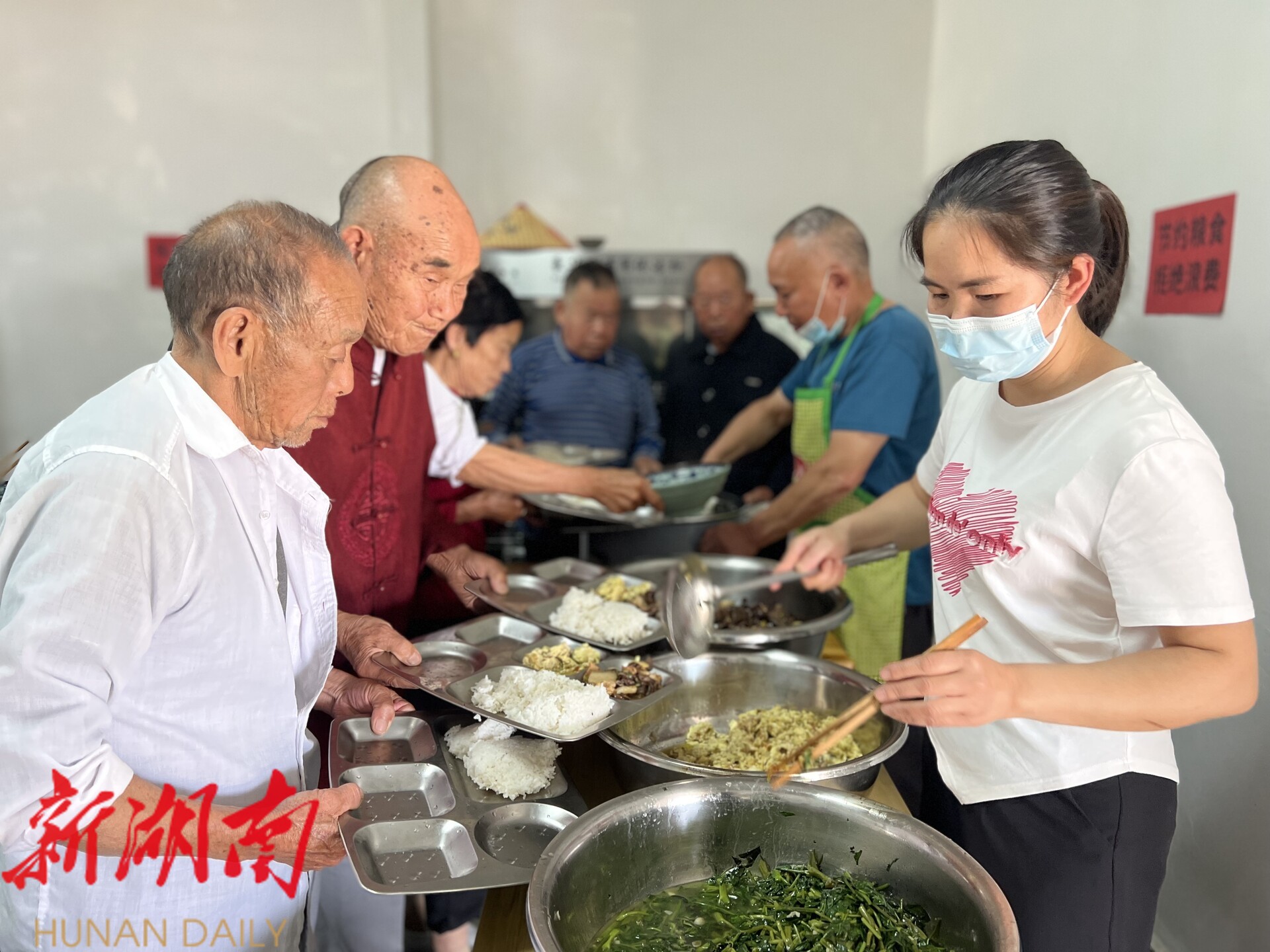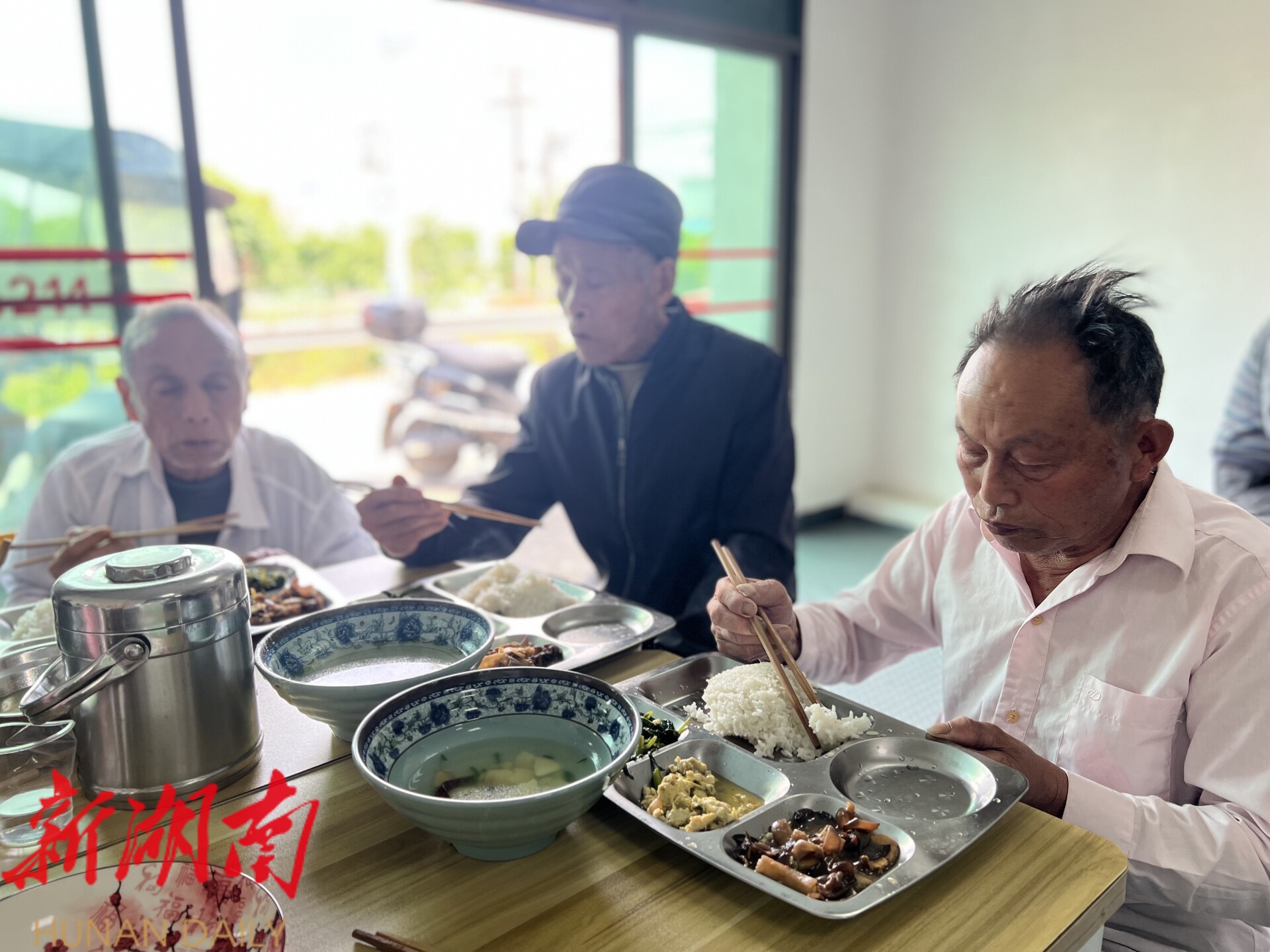 木耳炒肉、洋葱炒蛋、蒜蓉空心菜、土豆肉片汤……湘阴县岭北镇永红村长者食堂自助餐桌上,菜品荤素搭配,散发着诱人香气。