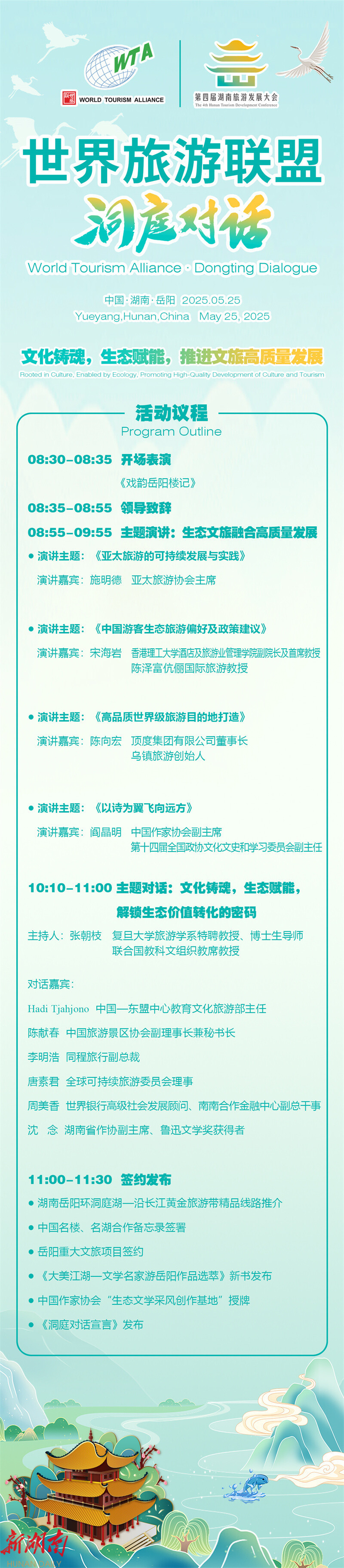 作为第四届湖南旅游发展大会系列配套活动之一 , 2025世界旅游联盟·洞庭对话 活动 以 “ 文化铸魂,生态赋能,推进文旅高质量发展 ” 为主题, 邀请来自 全球旅游组织、国际文旅机构、文旅研究机构、文学艺术组织、知名文旅企业等领域的中外嘉宾, 聚焦主题演讲、 主题 对话、签约发布等 环节, 深度挖掘 “ 文化+生态+旅游 ” 融合路径,充分展示岳阳深厚的文化底蕴和丰富的生态资源,全面塑造洞庭湖 “ 生态文旅标杆 ” 形象,为全球提供文旅与生态协同发展的中国智慧。 活动日程如下: